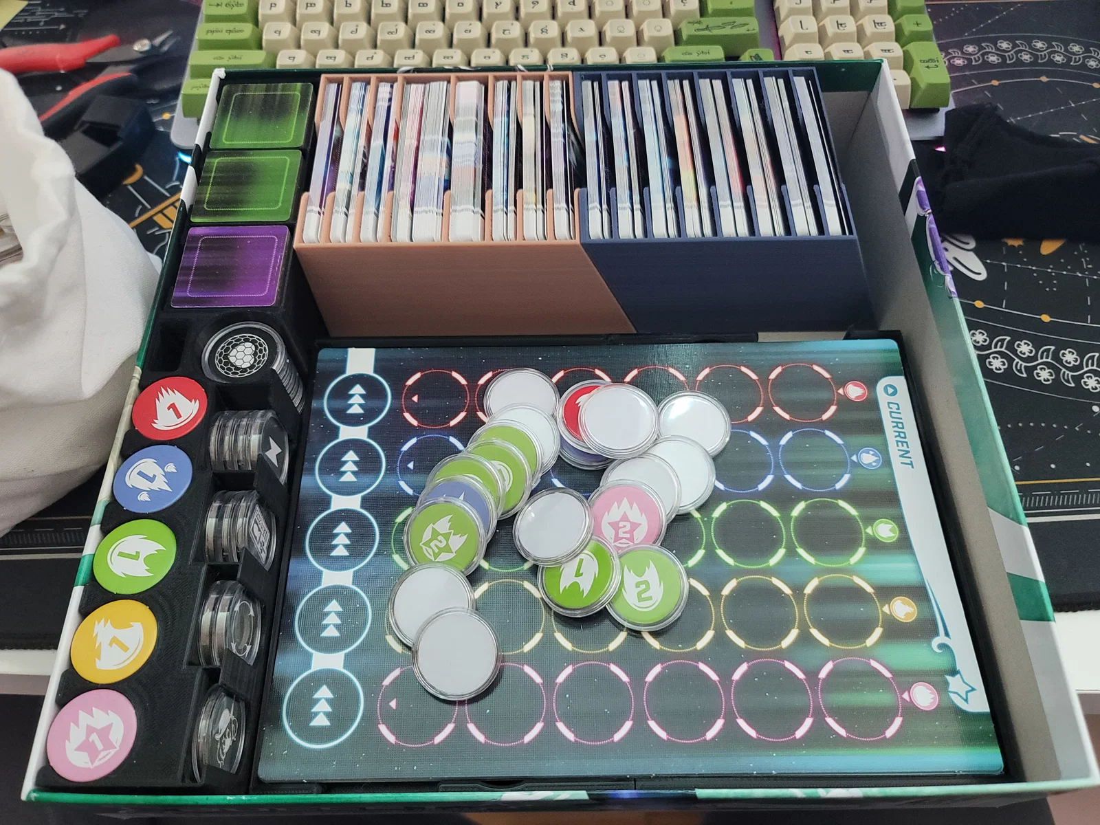 Với powerups: có một ngăn nông hơn hai ngăn còn lại, ngăn này dành cho coop powers (màu tím), còn mấy cái màu xanh thì để vừa ở hai ngăn kia.