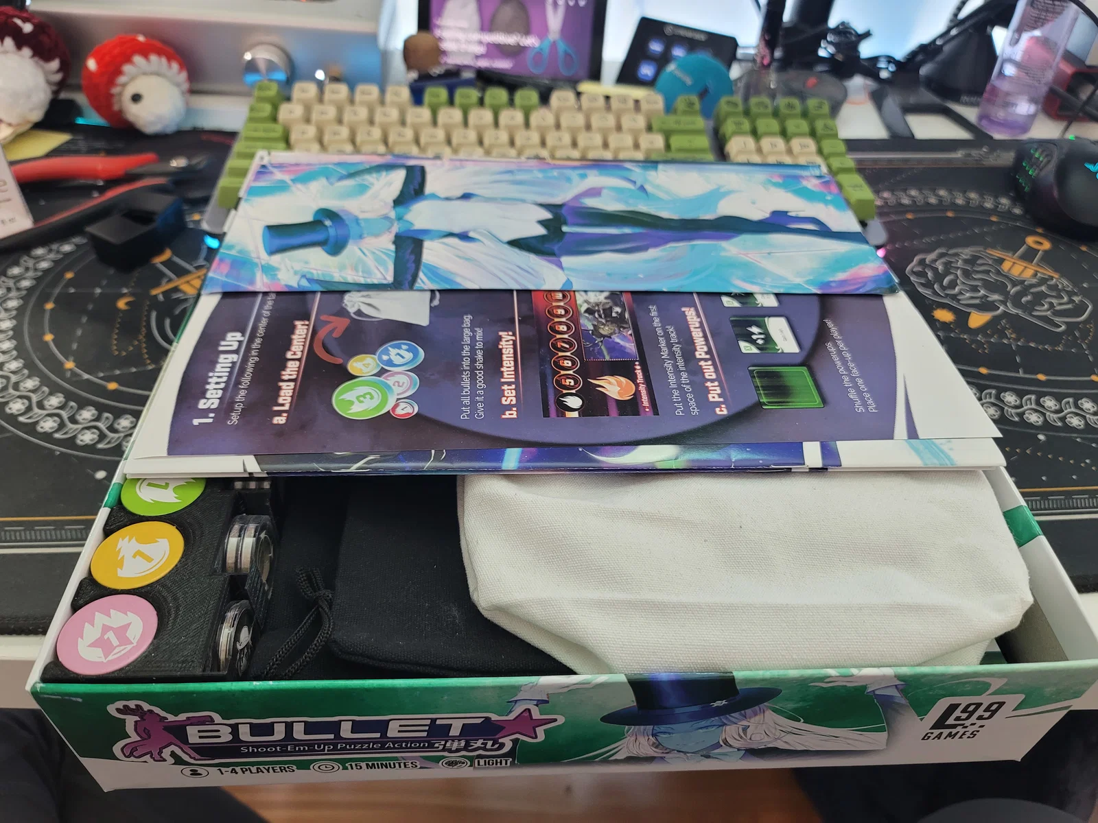 Insert lưu trữ cho Bullet Heart & Star khi dùng coin capsules: khay bullet dư 5 khu setup, ngăn token theo nhân vật, chỗ để boards (có thể cắt đôi in trên Mini), và khay thẻ/bài được đánh số để cất lại nhanh.