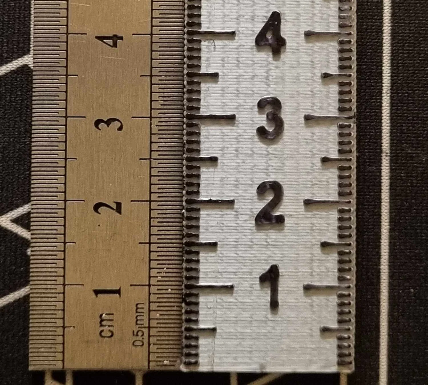 Vạch chia trên thước cao 0.5 mm, độ dày thước 3 mm. Bạn vẫn có thể in thước dày 2 mm hoặc thậm chí 1 mm, nhưng lúc đó thước sẽ rất mềm, cảm giác không chắc chắn chút nào.