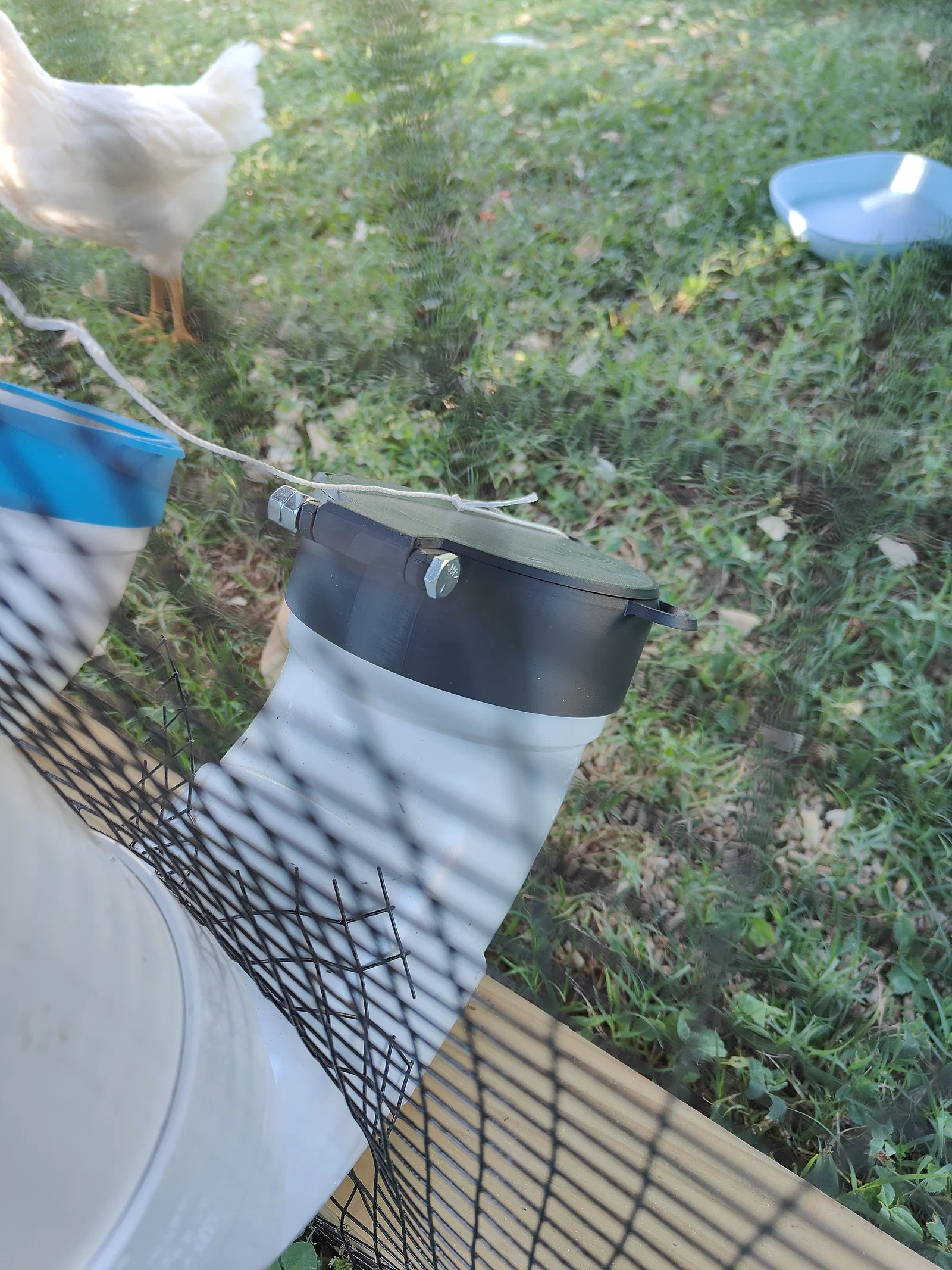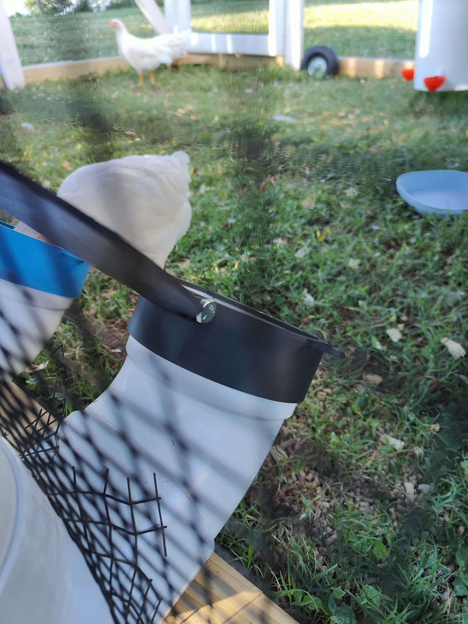 Nắp cho máng ăn gà PVC 4" dạng bản lề, giúp hạn chế đổ vãi và ngăn côn trùng/chuột vào ban đêm. Thiết kế chụp ngoài co 45° (không phải schedule 40), có khe nam châm 12x2mm và rãnh gioăng TPU (WIP).