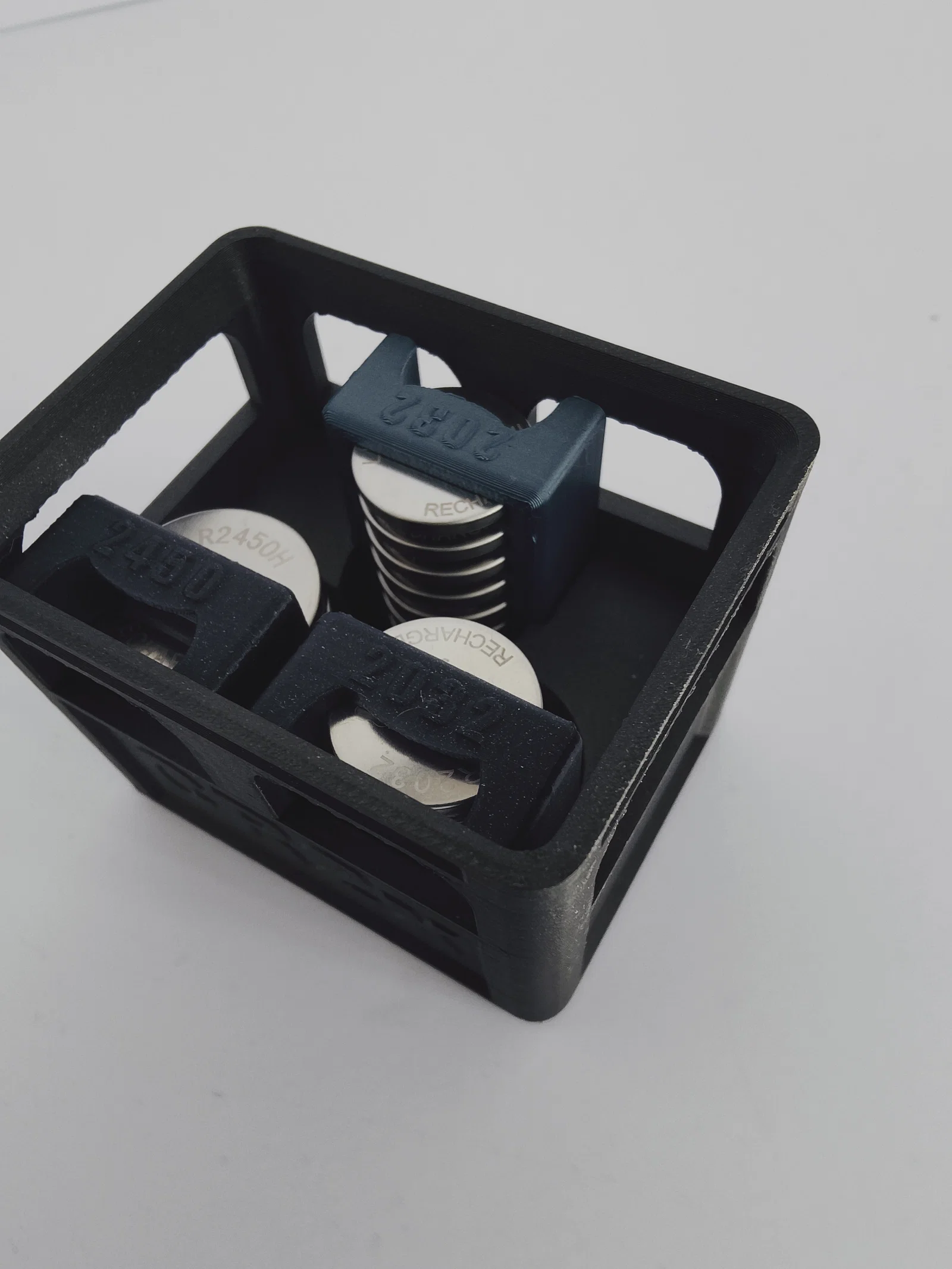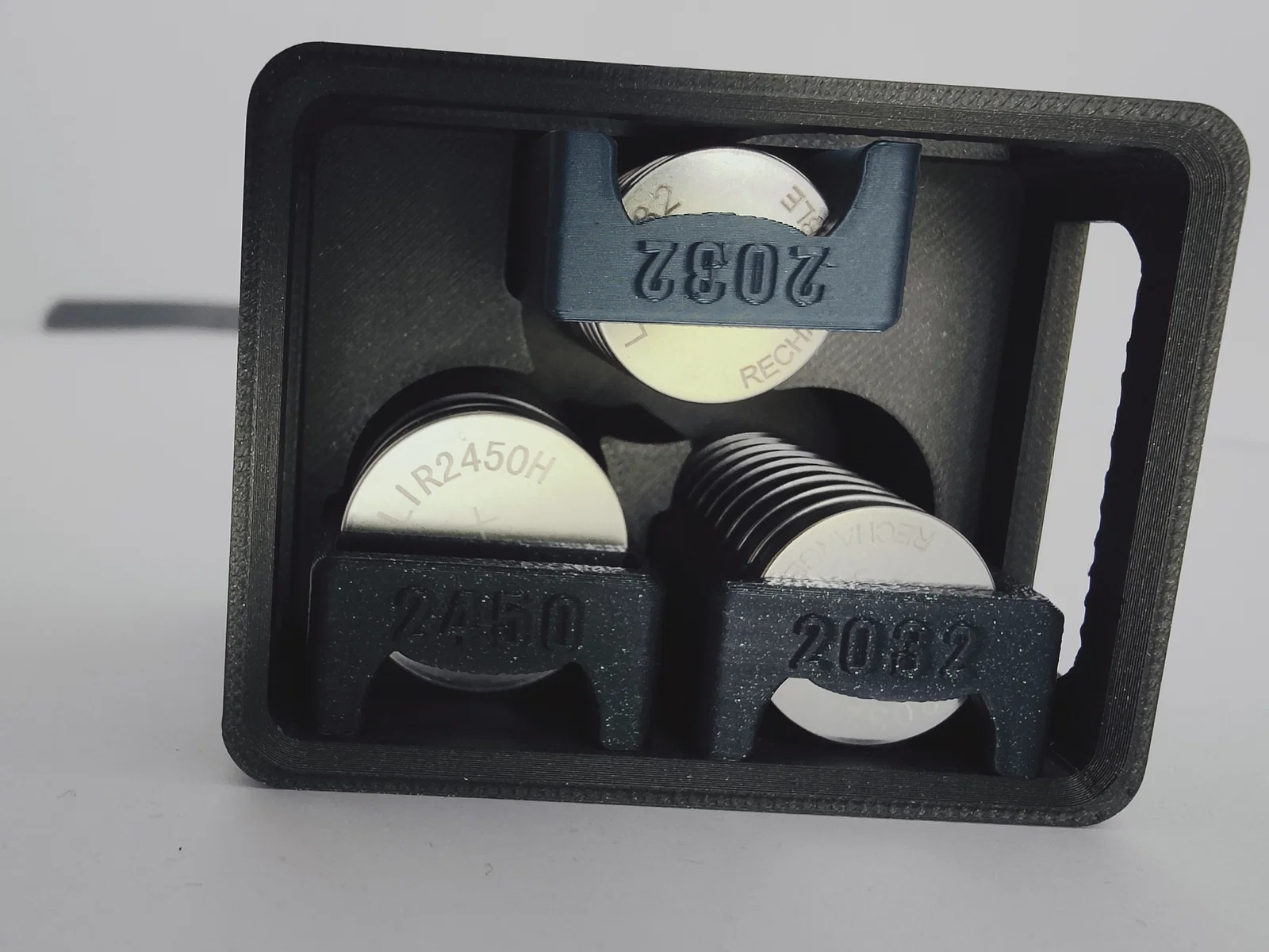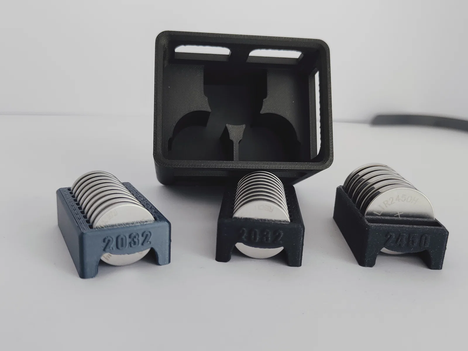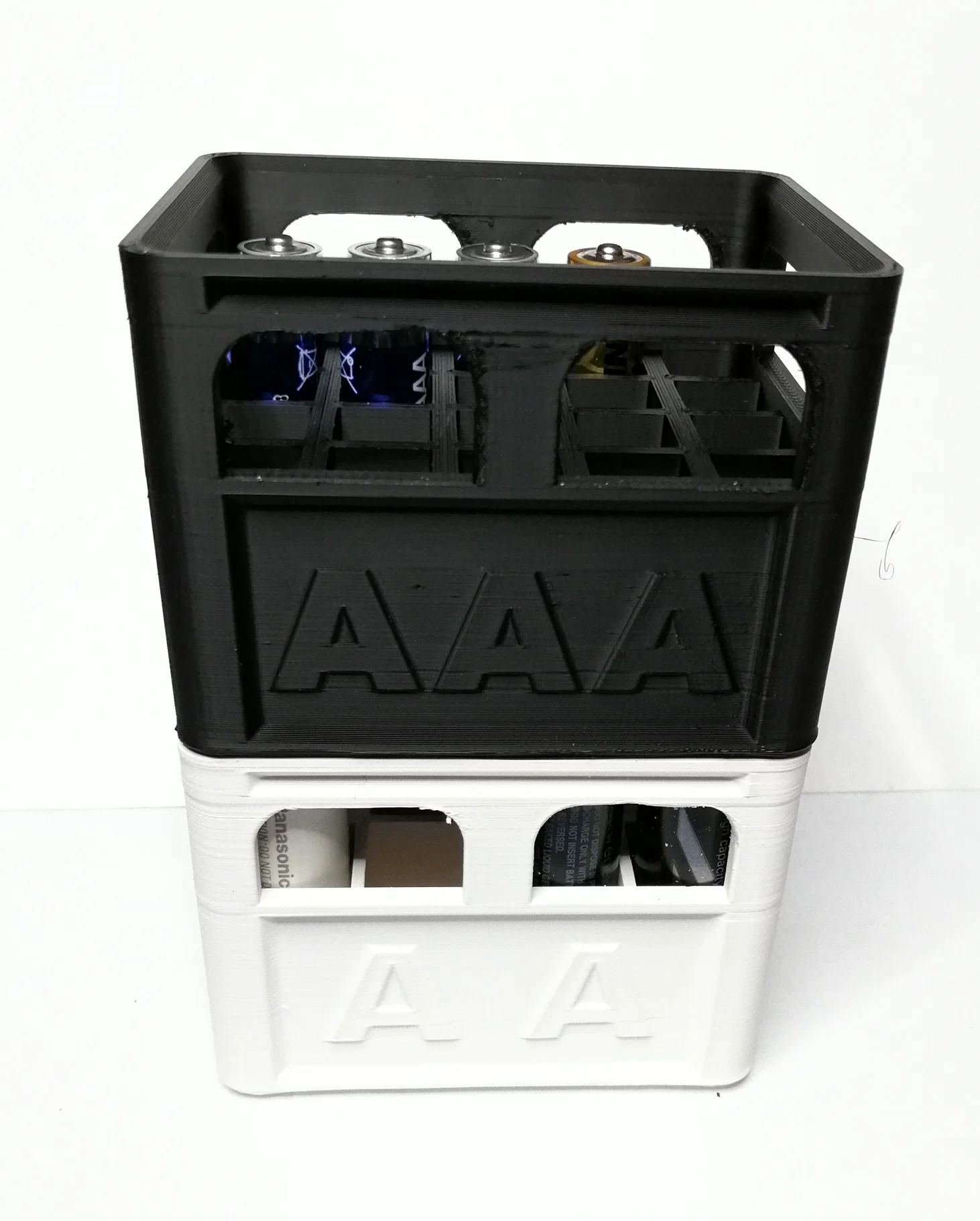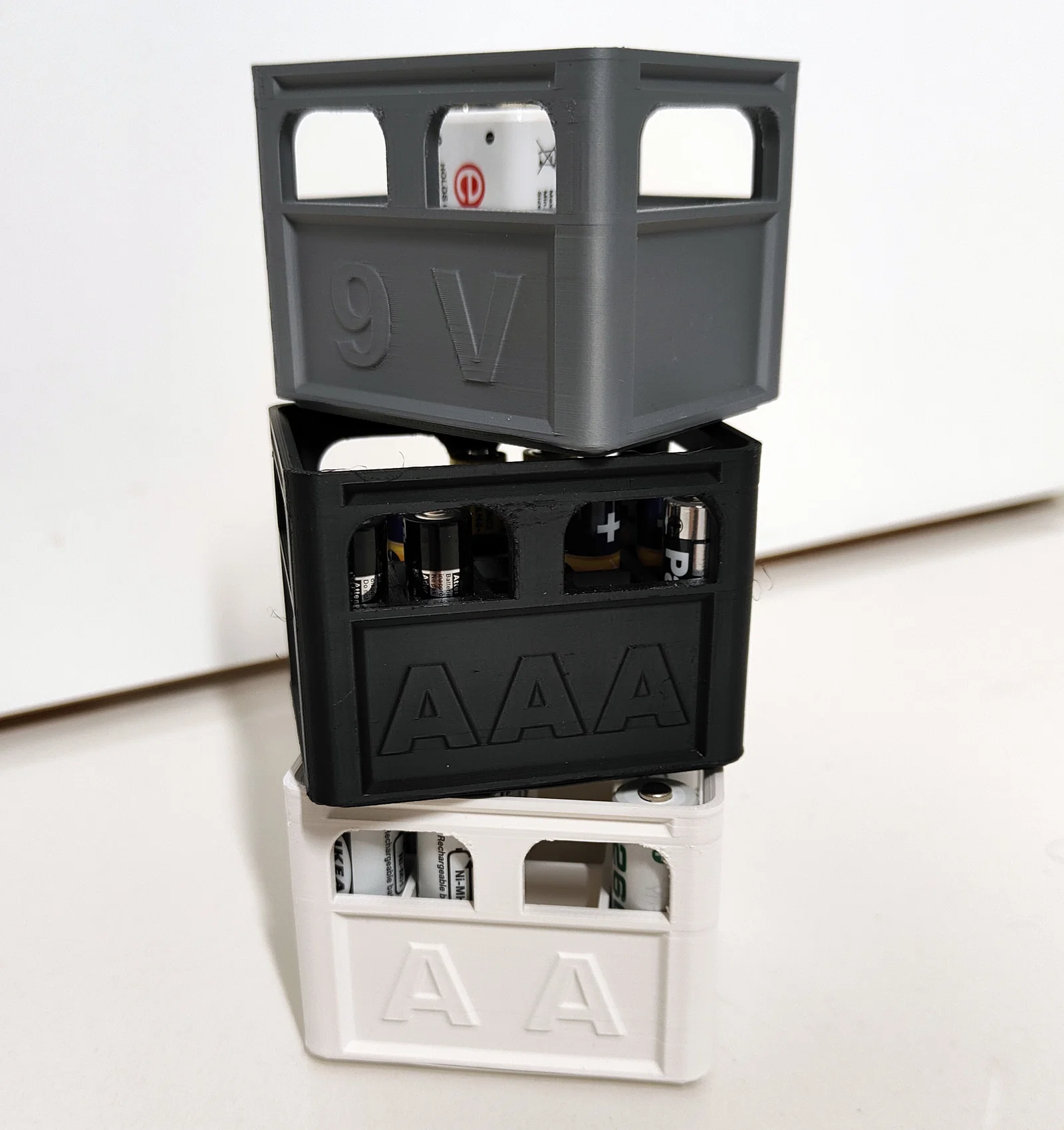 Hộp/khay đựng pin có thể xếp chồng, khóa khít kiểu như thùng chai. Kích thước chuẩn đồng nhất giúp xếp được AA, AAA và pin vuông 9V; bản cập nhật thêm hộp cho pin CR2XXX.