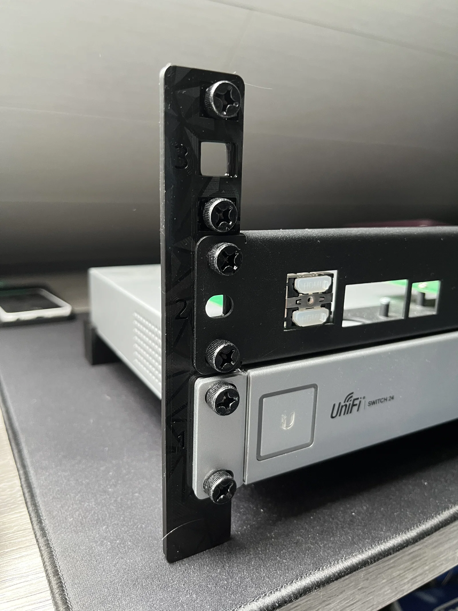 Mẫu Server Rack Desk stand giúp gắn thiết bị rack 1–4 RU chuẩn 10" hoặc 19" để đặt trên bàn. Có khoảng hở 1 inch phía dưới để đi dây/thoáng khí; có thêm rear stand cho switch. In thử trên Ender 3 S1 infill 40%.