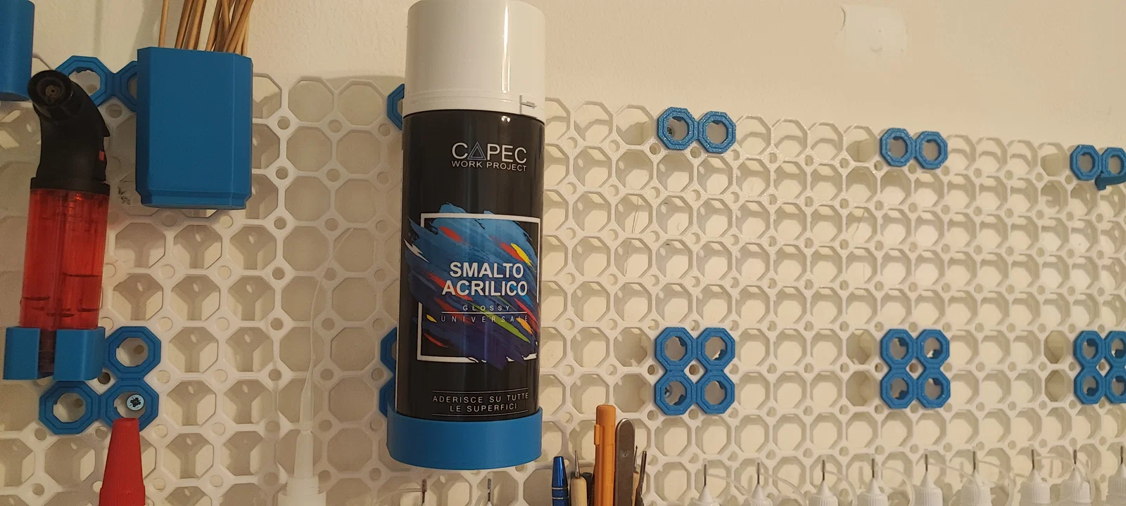 Sản phẩm này cực kỳ hữu ích cho những ai yêu thích việc tự tay sửa chữa, làm mô hình hoặc các công việc thủ công cần nhiều dụng cụ. Thay vì để các bình xịt nằm lăn lóc trên bàn, bạn chỉ cần gắn giá treo lên bảng Multiboard và đặt bình vào vị trí cố định. Nhờ đó, bạn sẽ dễ dàng lấy dụng cụ khi cần và trả lại chỗ cũ mà không làm vướng víu diện tích làm việc, giúp tăng hiệu suất công việc đáng kể.
