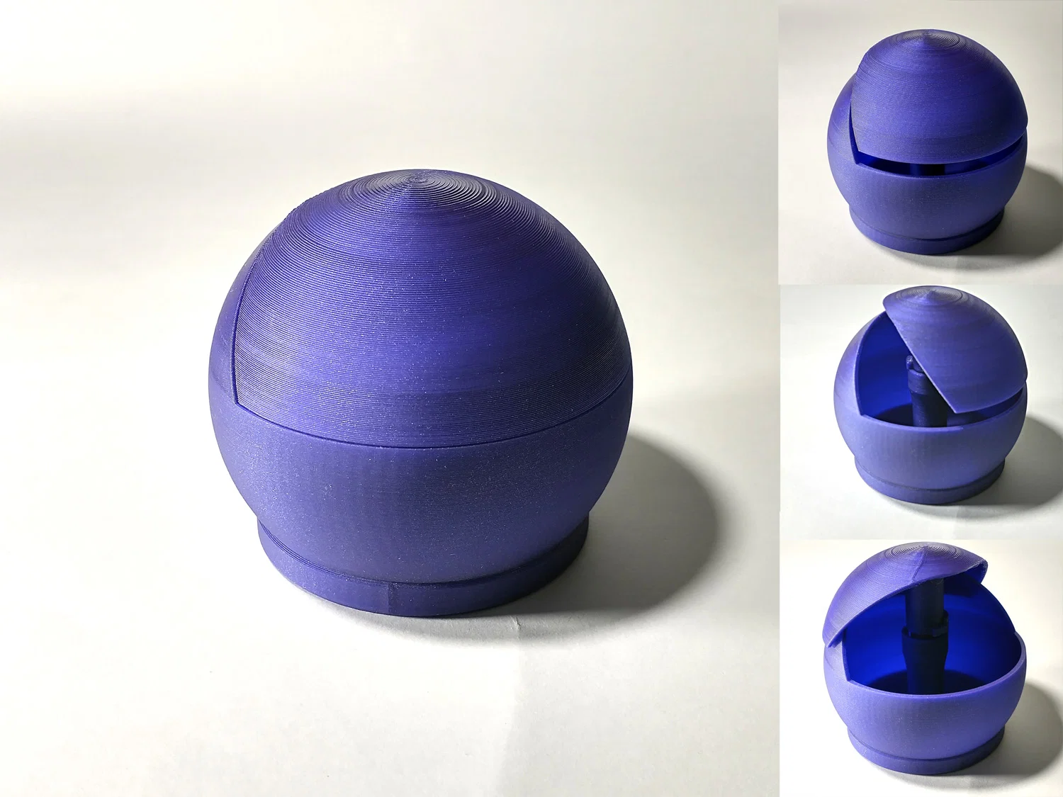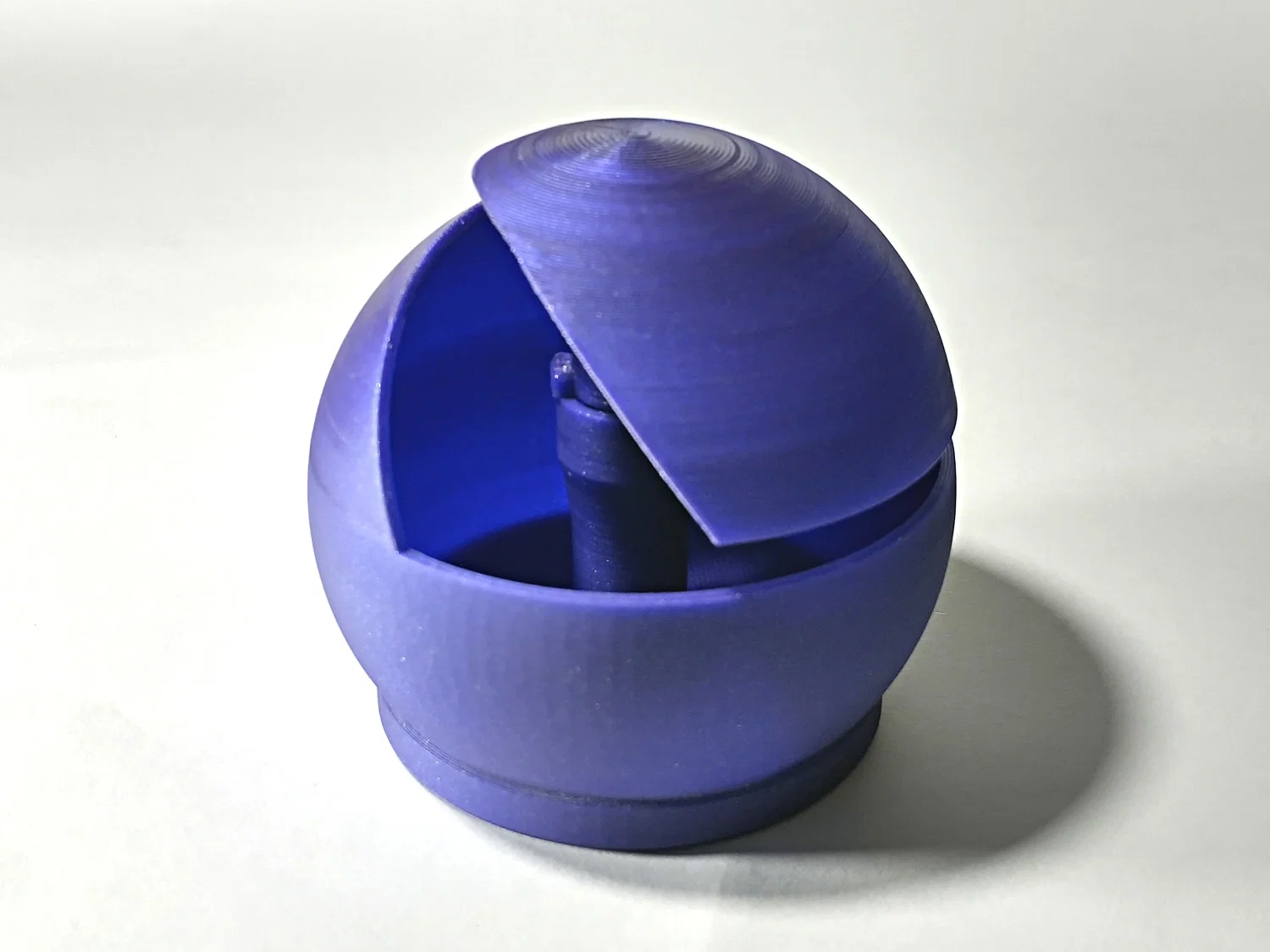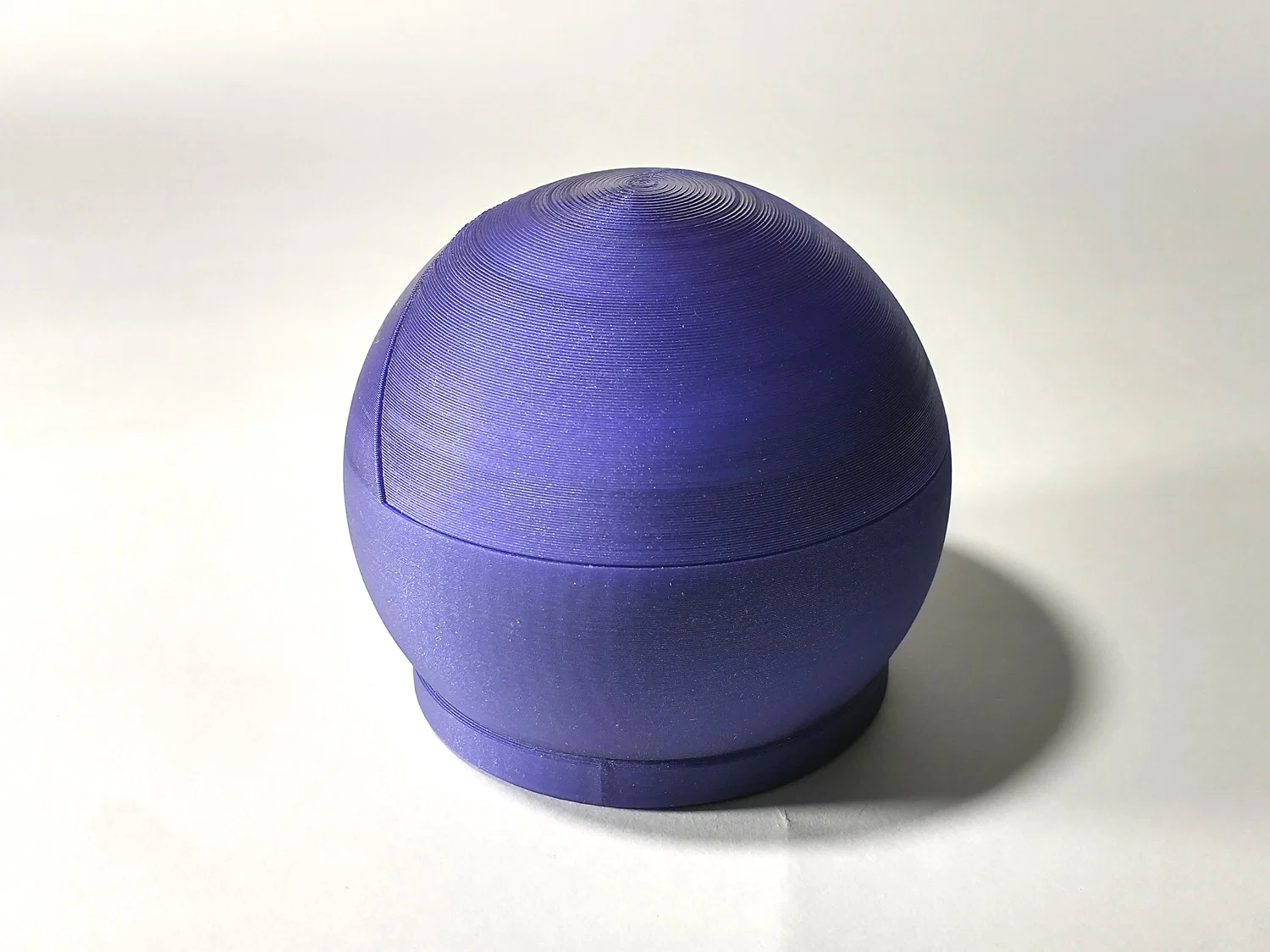 Orb Box là hộp dạng quả cầu đơn giản: vặn núm ở đáy là nắp phẳng nhấc lên rồi xoay sang bên để mở. In dễ với PLA; phần nắp nên dùng variable layer height và paint-in supports đúng vị trí để bề mặt mịn.