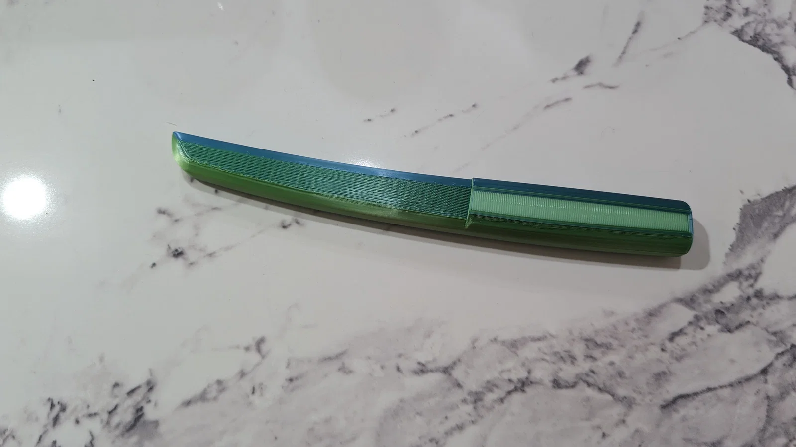 Mình làm model này với infill 70% để mô phỏng độ “đầm” giống các tanto tập bằng gỗ tụi mình dùng trong dojo. In ra rất ổn, cầm lên thấy nặng vừa và cân bằng. Các chỉnh sửa của mình có trong file bgcode đính kèm.