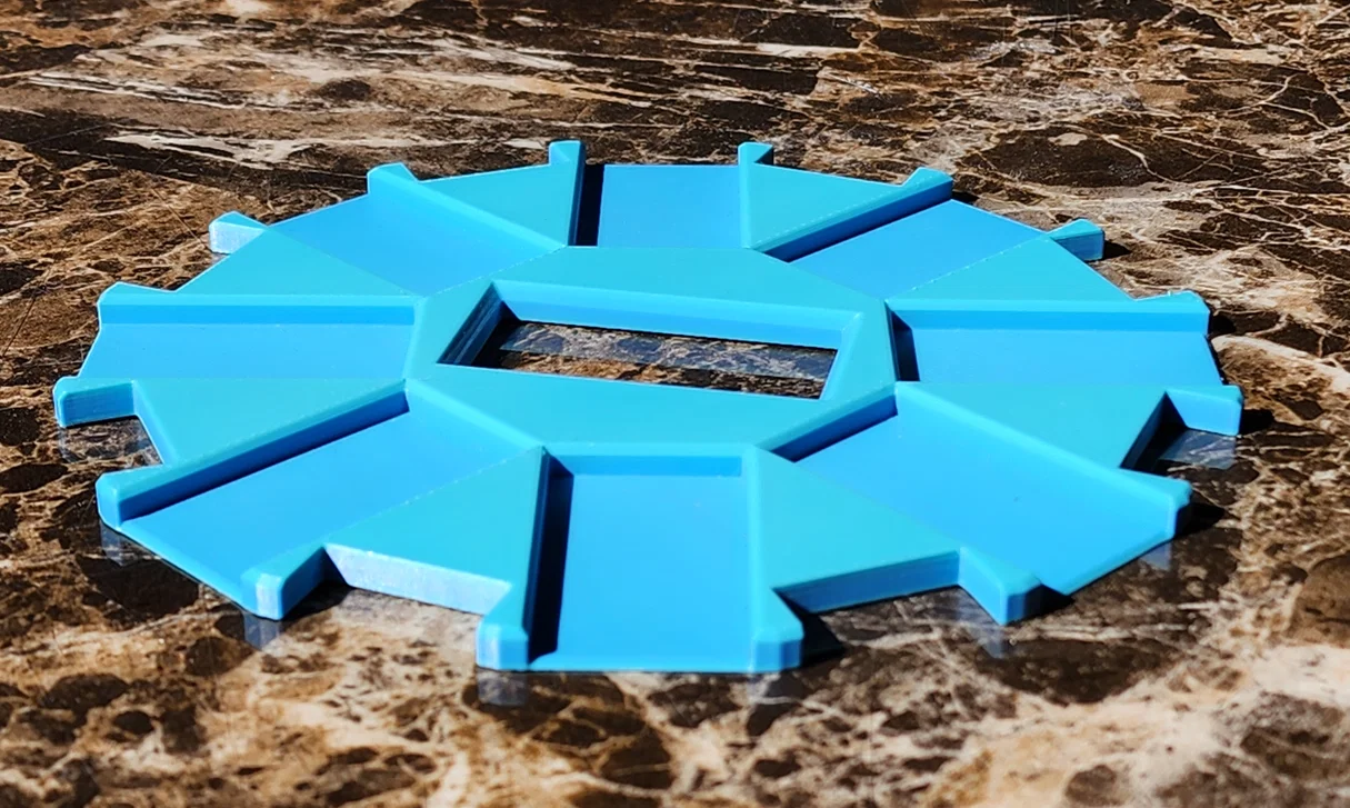 Khay giữ domino đặt ở trung tâm cho trò Mexican Train, có 1 khe cho quân đôi và 16 khe quanh viền. Hỗ trợ tối đa 15 người chơi (chừa 1 khe cho Mexican train). In bằng PLA/STL đều phù hợp, Bambu Gradient PLA nhìn rất nổi.