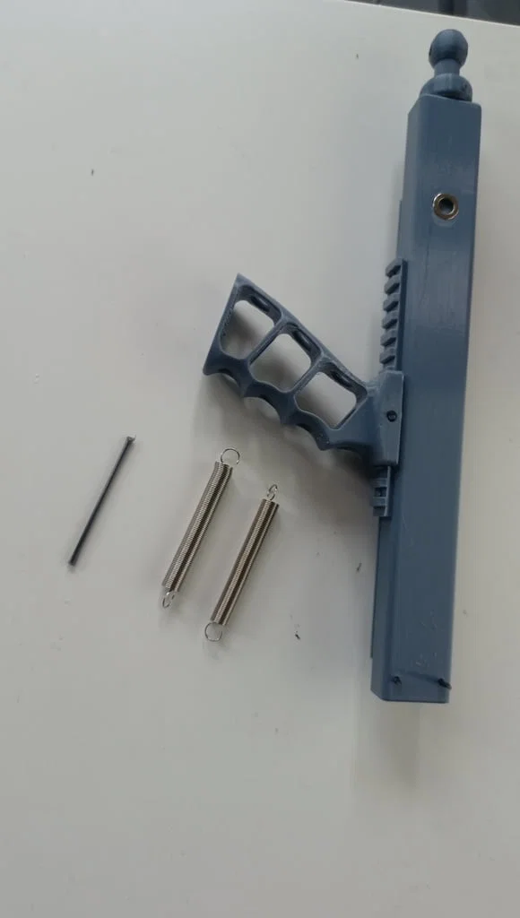 Mô hình “Slingshot gun” kèm hướng dẫn in: tăng infill để nặng tay, thiết lập supports phù hợp, và lắp ráp bằng cách dán chi tiết. Có thông số Guider 2s, PETG, 38% infill và ghi chú lò xo/chốt.