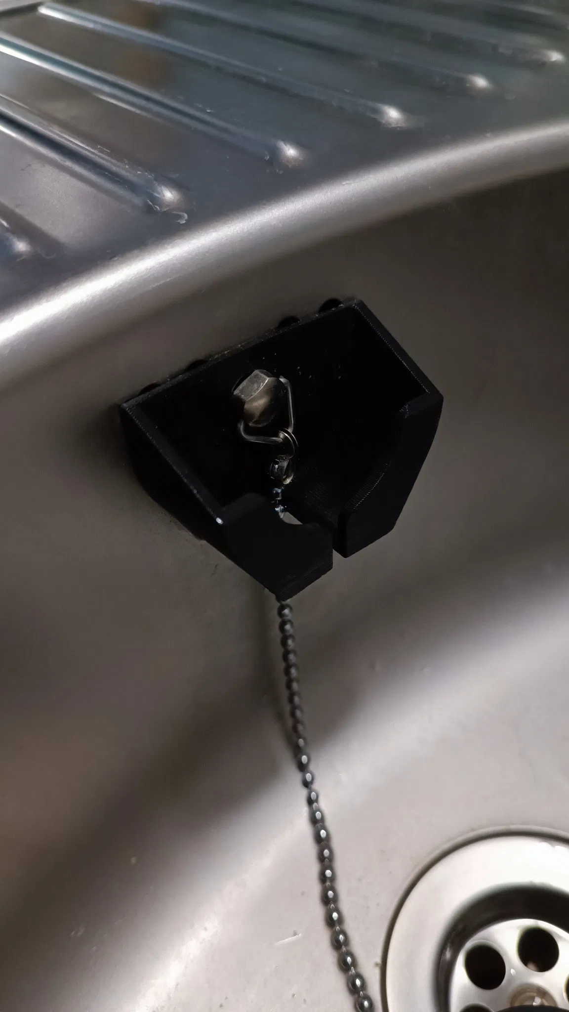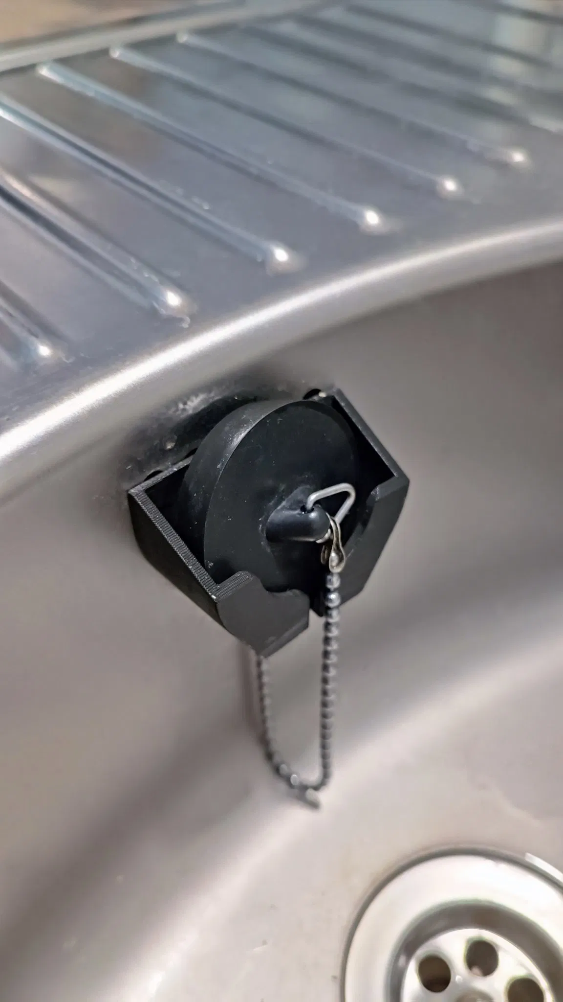 Bộ giữ này được thiết kế để giữ một cái nút thoát nước bằng cao su ~45mm. Nó gắn vào bên cạnh của ống thoát nước bằng bu-lông M6 mà dây xích được gắn vào. (Đường kính lỗ là 6.5mm hoặc khoảng ¼ inch).