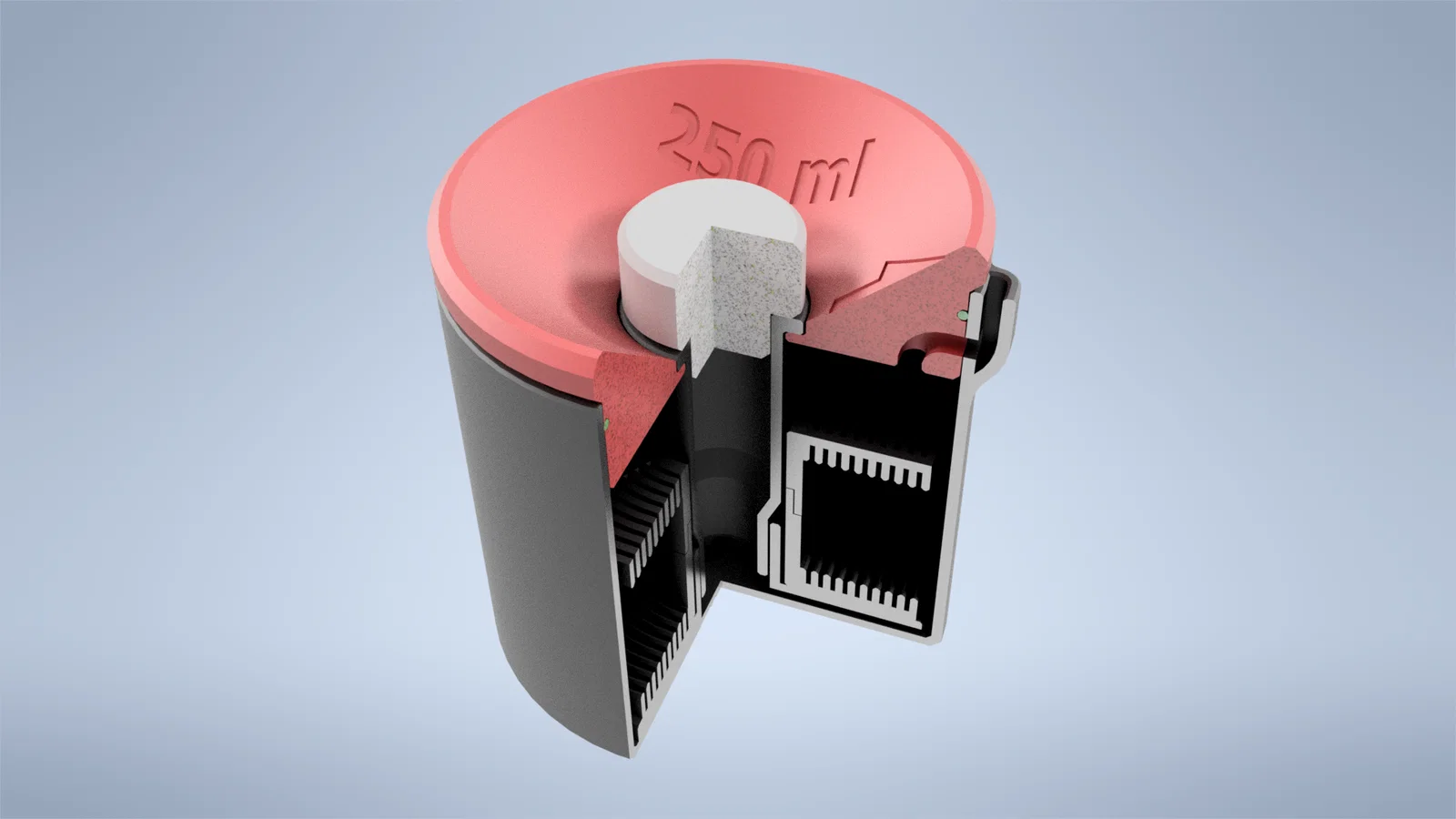 Gỡ các support tích hợp sẵn trong nắp. Cắt một đoạn filament dẻo vừa chiều dài. Bơm một ít keo vào rãnh oring trong nắp. Đặt filament dẻo vào đúng vị trí và lau phần keo dư.