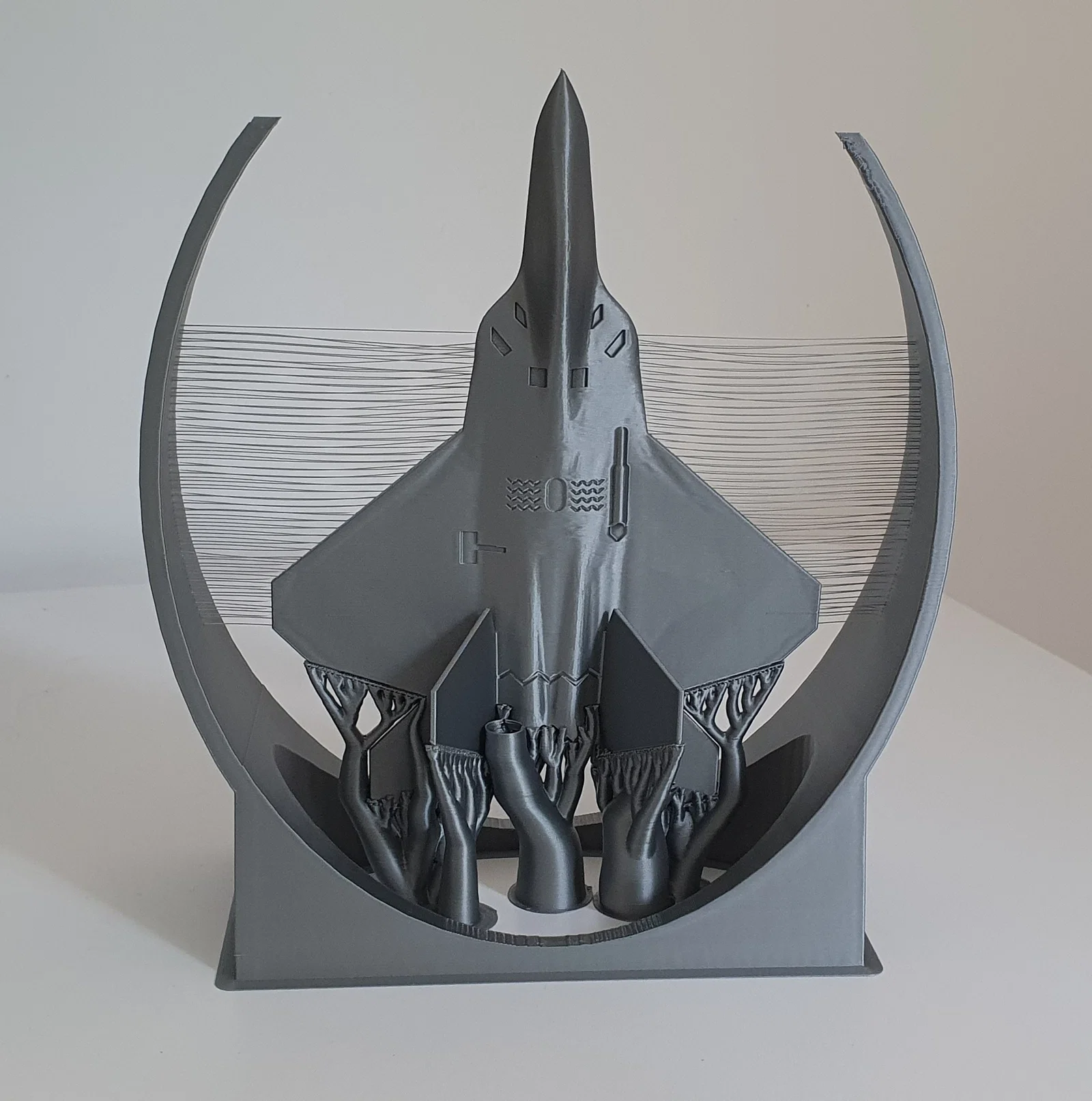 Mẫu F-22 Raptor với trưng bày kiểu string art tạo hiệu ứng lơ lửng như đang bay. Gợi ý cho file STL: có thể in nguyên khối hoặc cắt dưới chân đế để giảm support, dùng support blocker từ 2mm.