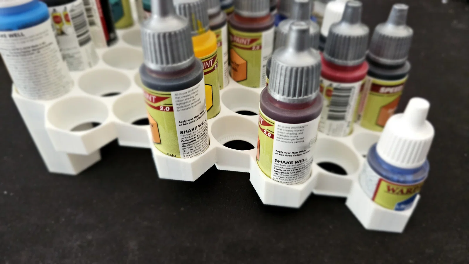 Mẫu kệ/giá đỡ dành cho chai sơn Army Painter. Có 2 phiên bản: bản full in đẹp, không cần supports nhưng tốn filament; bản reduced tiết kiệm filament hơn nhưng dễ thấy khuyết điểm và cần supports. Khuyên dùng file 3mf.