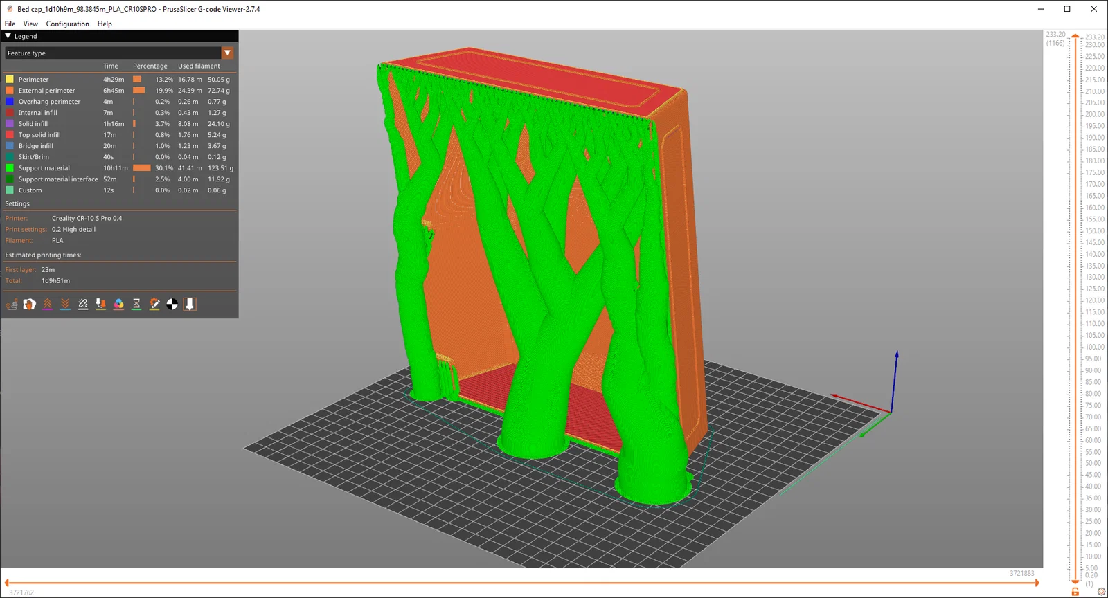 In bằng tree/organic supports cho phần nóc và mặt dưới, dùng nozzle 0.4mm để lên được 3 perimeters nhằm tăng độ cứng và độ ổn định khi in như trong hình minh hoạ.