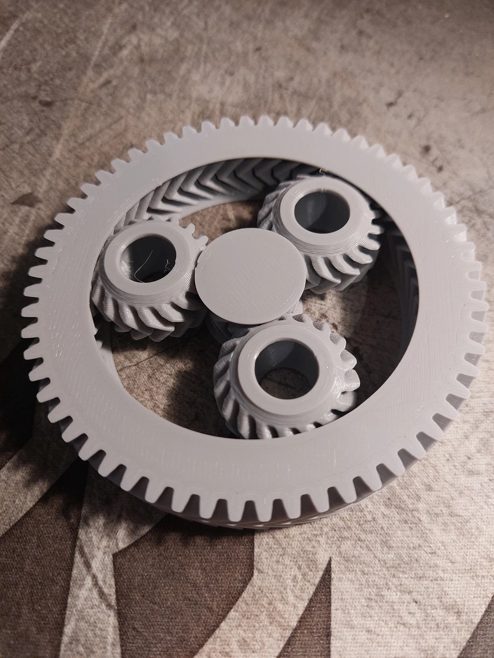 Fidget spinner dạng planetary gears với thiết kế double helix độc đáo, print in place. Kích thước 100 mm đường kính, dày 16 mm; có thể scale cho vừa tay. Gợi ý tăng infill để hiệu ứng flywheel quay lâu hơn.