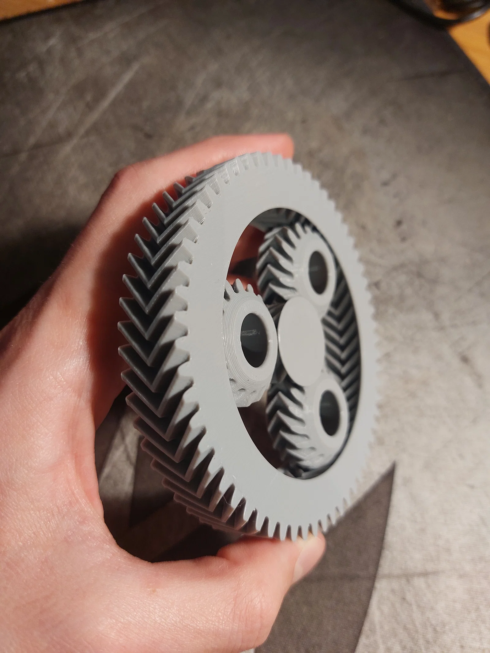 Một mẫu fidget spinner có dùng planetary gears. Đây là một món fidget toy rất hợp để giảm căng thẳng. Thiết kế double helix của bộ gear tạo ra một phong cách thẩm mỹ lạ mắt và mới mẻ. Mẫu có đường kính ngoài 100 mm và dày 16 mm. Bạn có thể scale lại cho vừa tay mình.