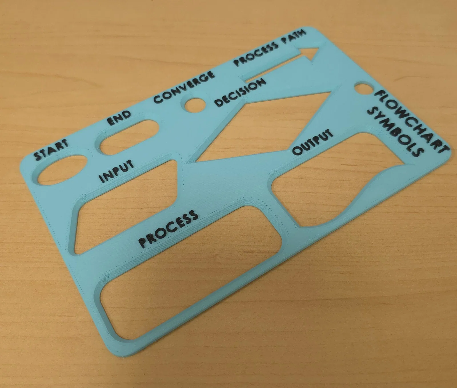 Đây là một cái stencil tụi mình thiết kế cho sinh viên năm nhất ngành kỹ thuật, để dùng lúc vẽ flowchart bằng tay. Tất cả các “island” đều được ghi nhãn rõ ràng với màu tương phản cao, và file 3mf đi kèm có sẵn mã để đổi màu đúng tại điểm bắt đầu phần chữ cho màu thứ hai. Cái lỗ không có nhãn là để treo stencil lên cho dễ lấy dùng hoặc trưng bày, mà vẫn không làm cùn/bo mòn các mép vát (beveled edges) của các island trên stencil.