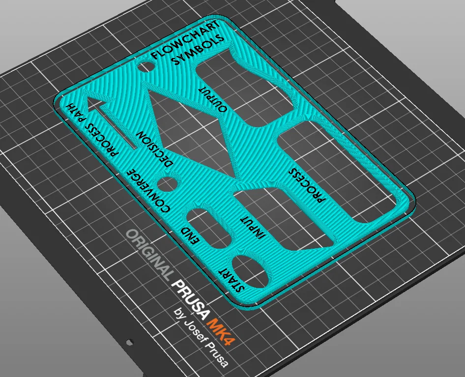 Stencil hỗ trợ sinh viên kỹ thuật vẽ flowchart bằng tay. Các island được ghi nhãn rõ, màu tương phản cao; file 3mf có mã đổi màu ngay lúc bắt đầu chữ. Có lỗ treo tiện trưng bày, khuyến nghị dùng tall skirt/purge tower để chữ sạch.
