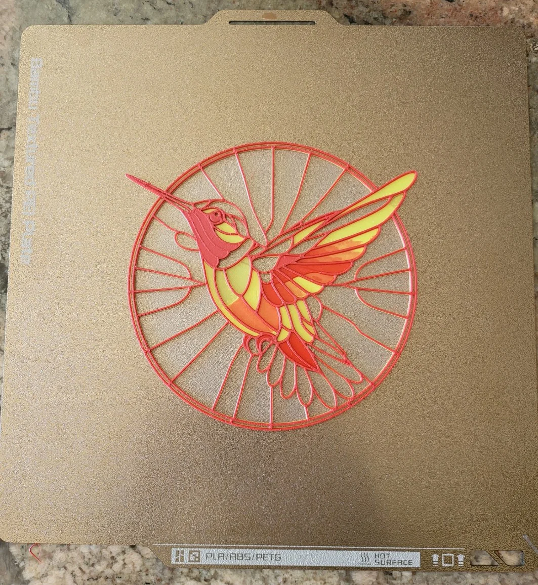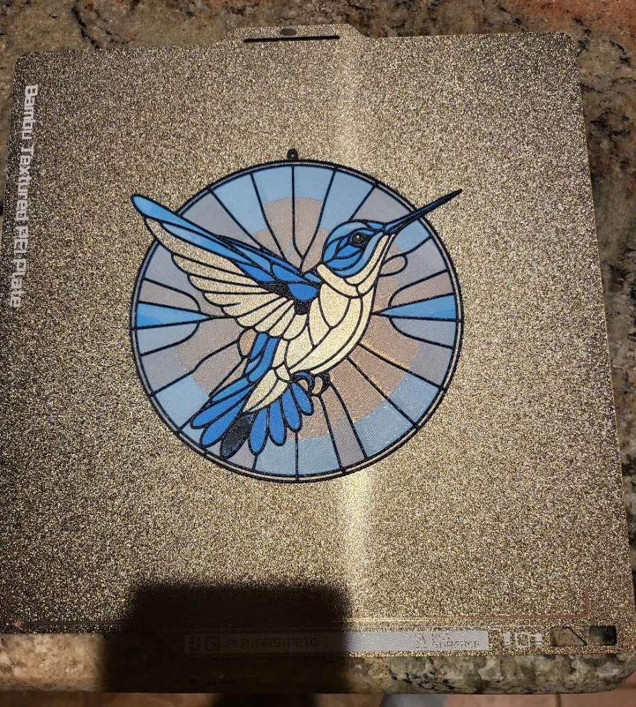 Mình dùng kiểu HueForge Lithophane Blending Type và một hình do AI tạo để làm bản in chim ruồi phong cách “stained glass” này thành HAI phần. Phần 1 chỉ có các mảng xanh và đen của chim ruồi ở tiền cảnh. Phần 2 sẽ để trống (blank) phần tiền cảnh và các mảng xanh của chim ruồi, đồng thời cung cấp các mảng đỏ và vàng cho phần nền.
