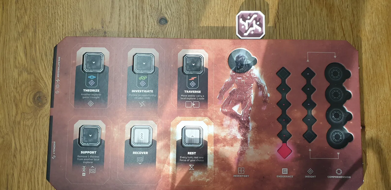 Đây là một token đơn giản để đánh dấu người chơi đang hoạt động trong Unsettled. Khi chơi một mình, tôi thường quên lượt của ai, đặc biệt là trong giai đoạn sau của trò chơi khi có nhiều hành động miễn phí được kích hoạt mỗi lượt.