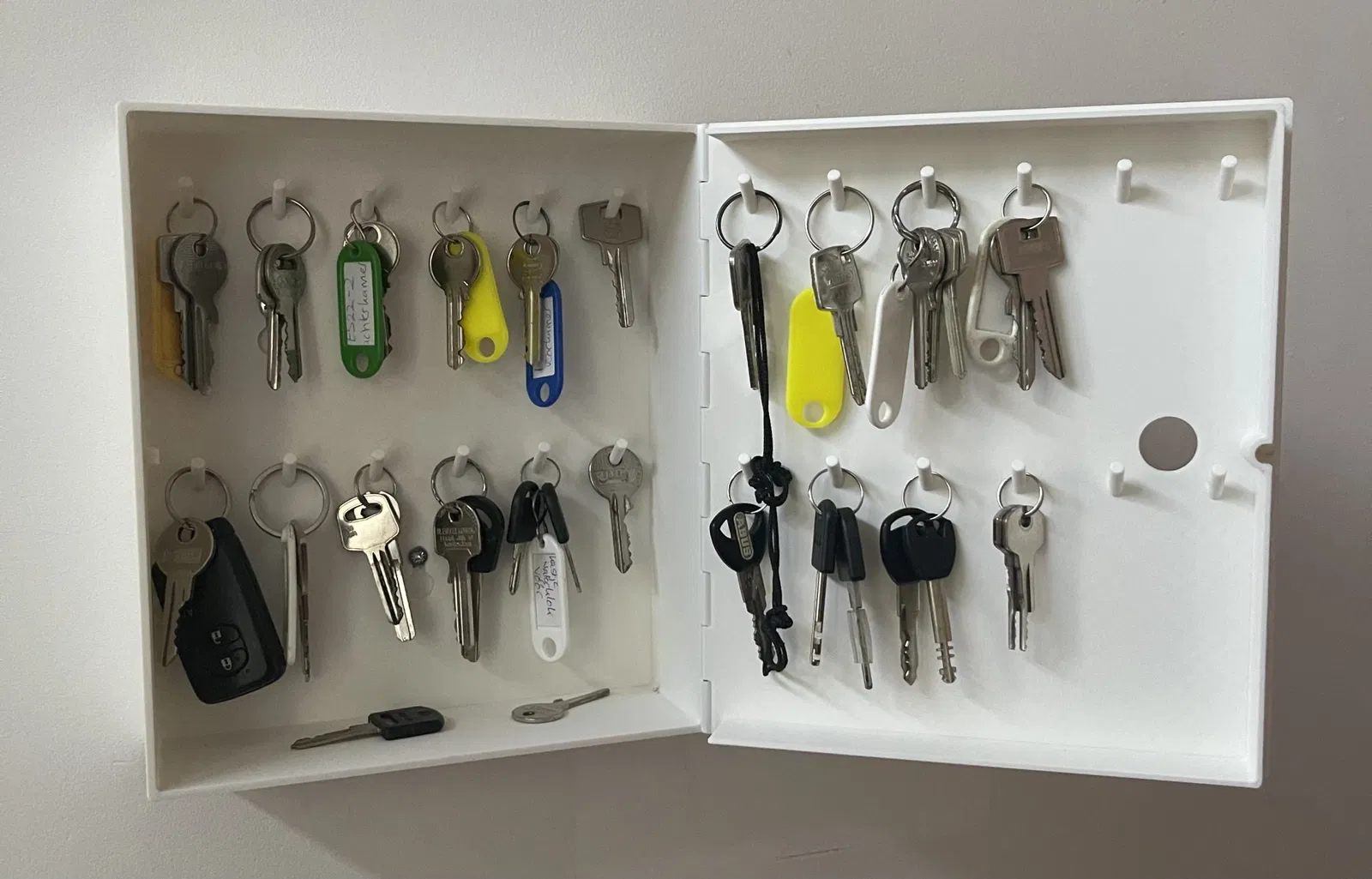 Một hộp chìa khóa có chỗ cho 24 phím. Được gắn trên tường. Kích cỡ Độ sâu: 73 mm (đóng) Chiều rộng: 210 mm Chiều cao: 240 mm