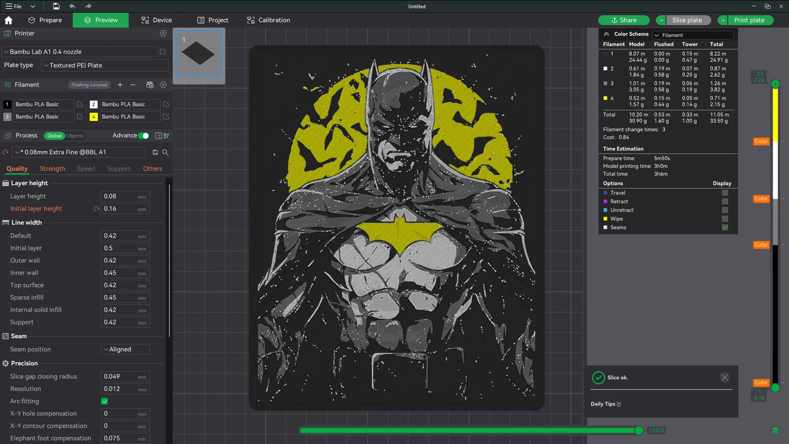 Mẫu HueForge chủ đề Batman để trang trí treo tường. Có thể chỉnh kích thước theo X/Y nhưng không đổi trục Z. In 100% infill, layer height 0.08mm (base 0.16mm) và thay màu theo các mốc layer được hướng dẫn.