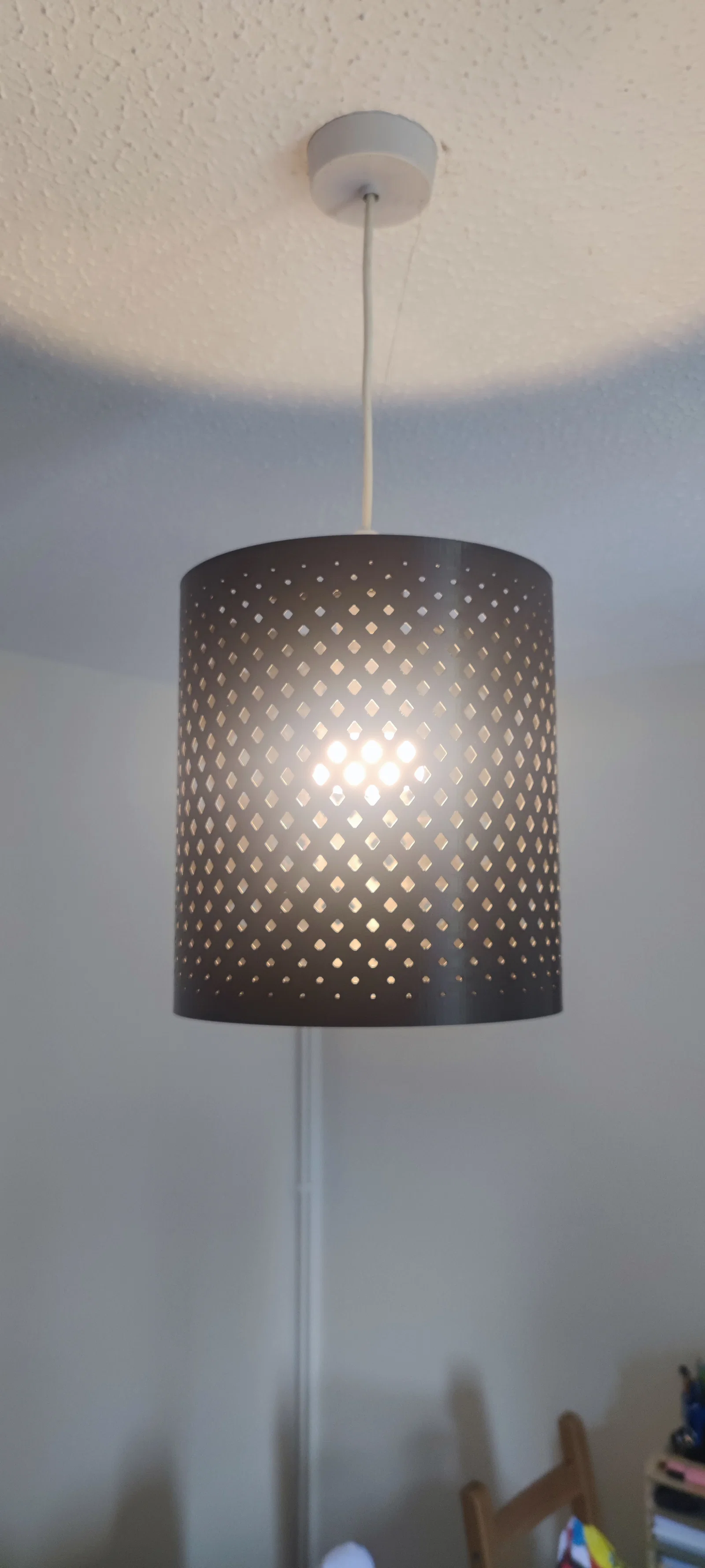Chụp đèn 3D printed họa tiết kim cương, nhẹ và in nhanh nhờ độ dày chỉ 0.6mm. Kích thước 230×220mm, tạo hiệu ứng đổ bóng đẹp mắt. Tương thích đui đèn trần chuẩn BC đường kính 34mm.