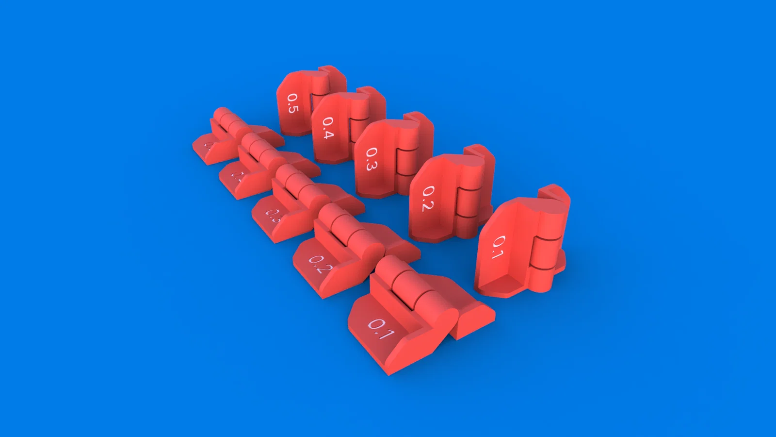 Mẫu test dung sai bản lề print-in-place giúp bạn chọn kích thước khe hở (gap) phù hợp khi tự thiết kế hinge. Gap từ 0.1–0.5mm theo cả ngang/dọc; gợi ý thực tế: 0.2–0.3mm cho kết quả tốt.