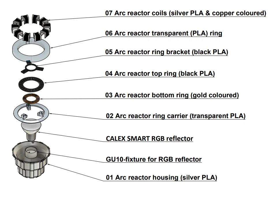 Bảy bộ phận khác nhau trong mẫu này được thiết kế bằng bản miễn phí Autodesk Fusion 360 (loại “Not for commercial use”). Thông tin chi tiết hơn có trong phần mô tả file bên dưới. Mình dựng phần vỏ (housing) của Arc reactor sao cho lắp vừa đui GU10 và một bóng/spot CALEX SMART RGB LED nhỏ, rẻ (€10,-) kích thước (54(h) x 50(Ø) mm) (5W, 345 lumen). Ngoài ra mình còn dựng: ring carrier, bottom ring, top ring, ring bracket, coils, và một transparent ring để ánh sáng RGB LED tán đều hơn. Vì mình không muốn dùng liên kết snap-fit (độ “bấm” có thể khác nhau tùy máy in), nên các phần cần phải dán keo. Việc lắp ráp khá đơn giản, và có hướng dẫn lắp bên dưới.