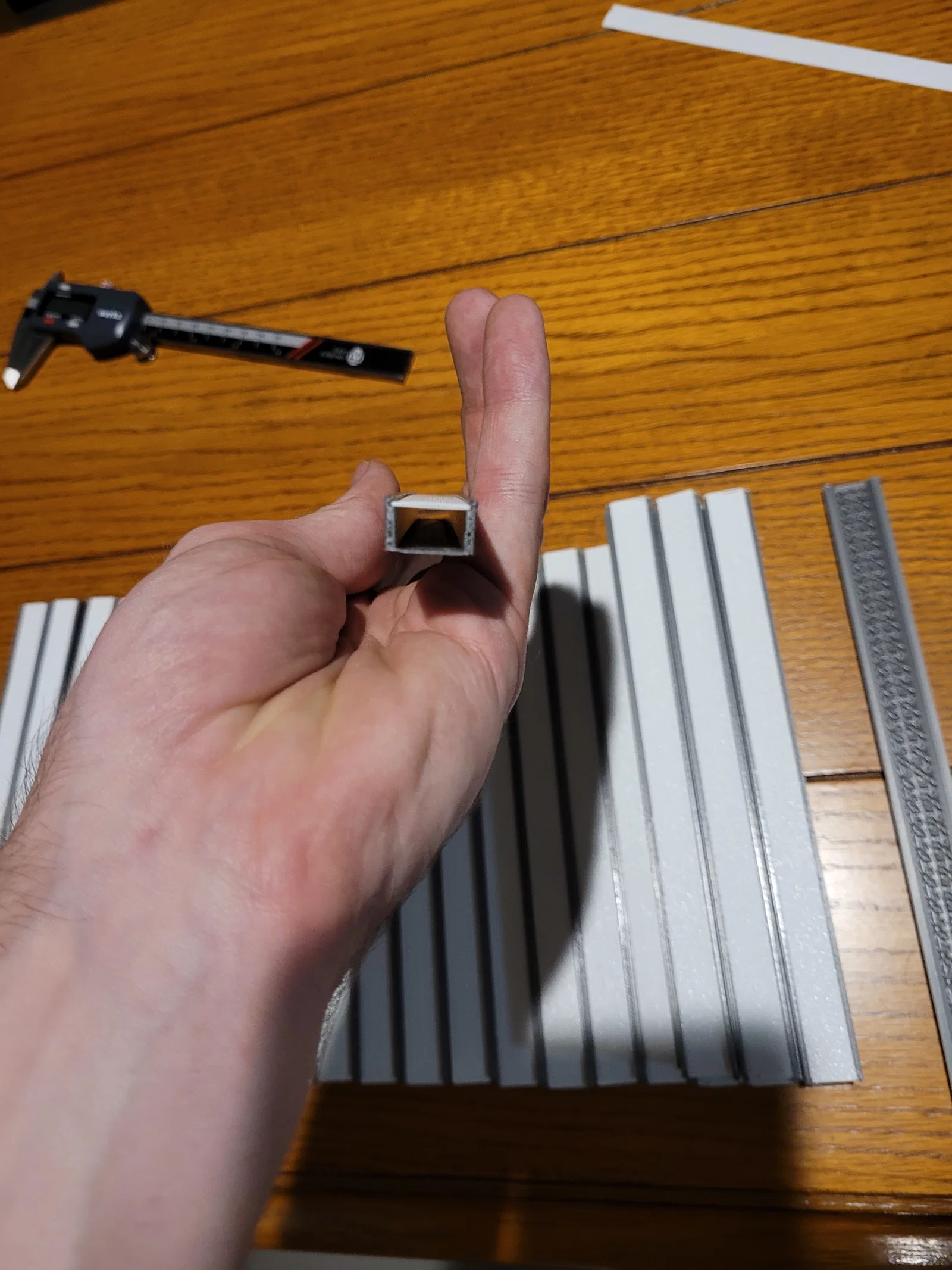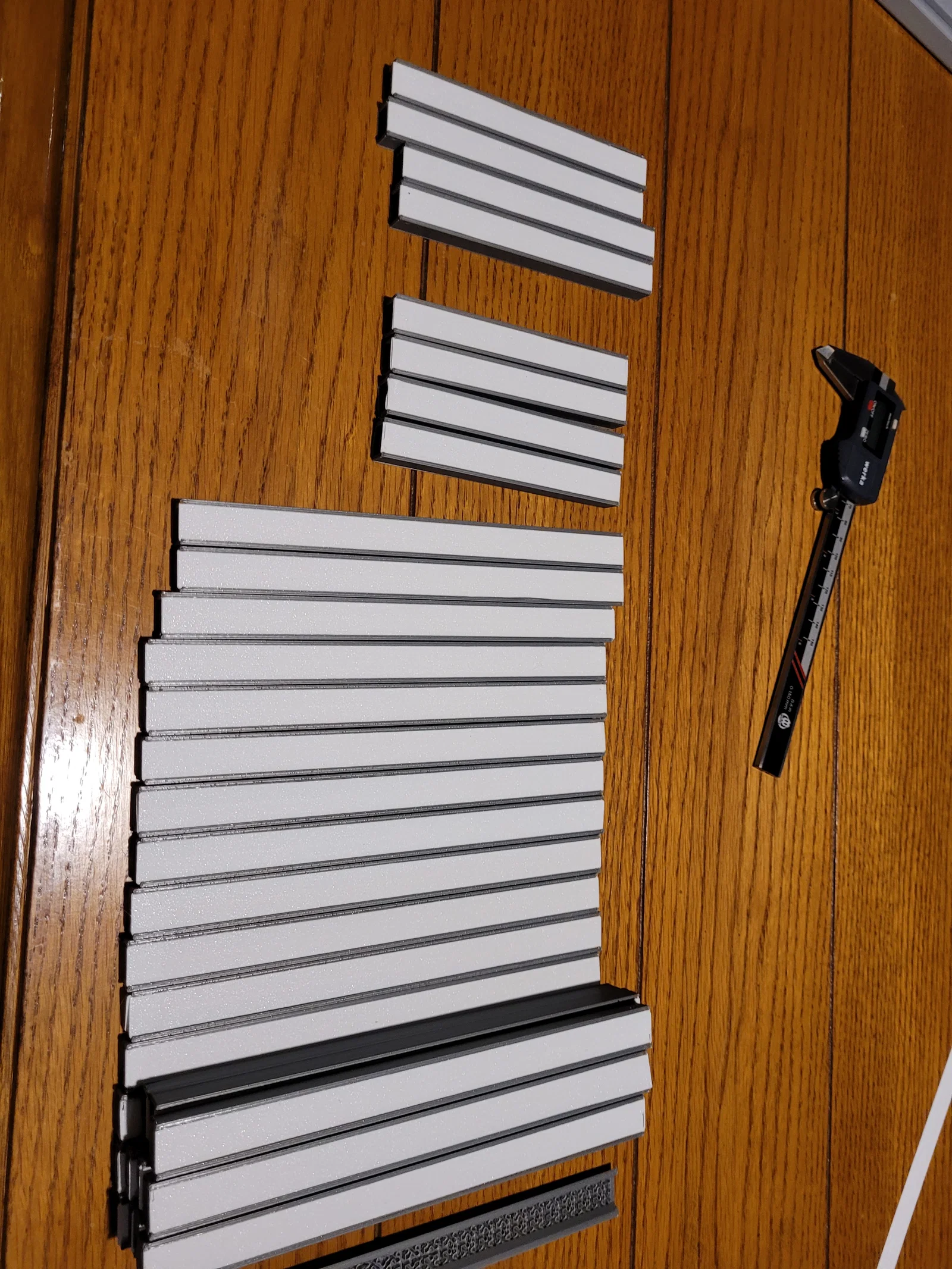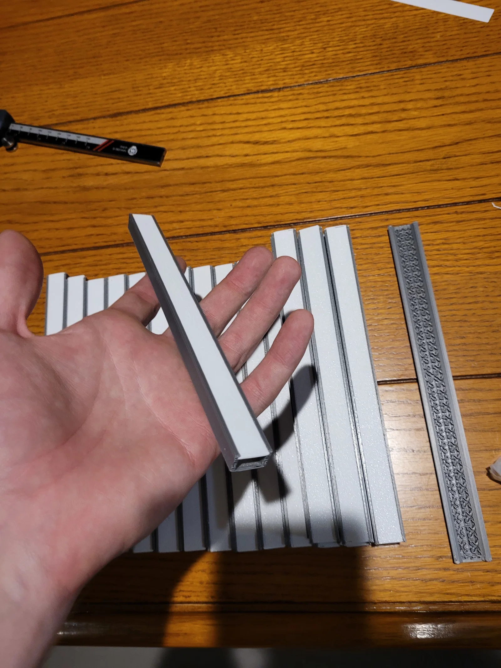 Bộ lắp ráp gồm 4 phần: thân đèn (light housing), tấm tán sáng (diffuser), các ngàm/bracket ở giữa (middle brackets) và ngàm/bracket góc (corner brackets). Các dải diffuser được in dạng một lớp (single layer), mình dùng 2 miếng in single layer như vậy cho mỗi thân đèn. Các bracket được gắn bằng băng keo 2 mặt loại dày. Với corner brackets, đặt mặt phẳng áp xuống build plate và dùng supports thường. Bản mình in dùng ABS cho thân đèn và các bracket, còn PLA cho các dải diffuser. Thân đèn hơi mỏng manh nên không nên in kèm supports.
