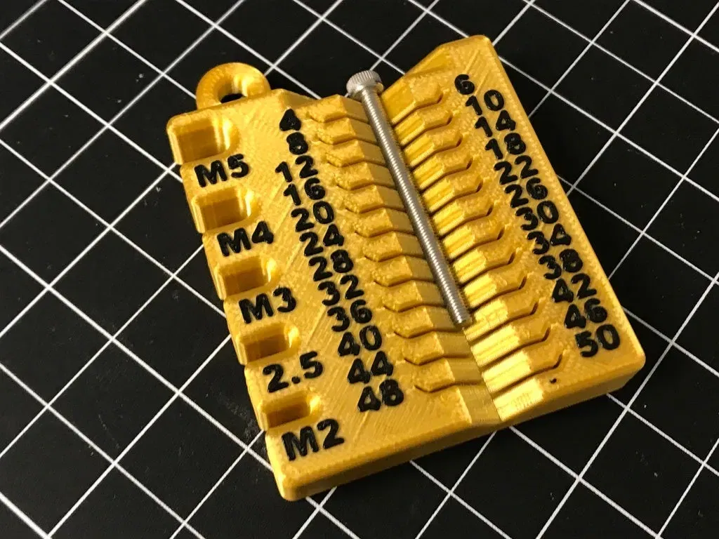 Nhanh chóng phân loại và đo các vít và bu lông theo kích thước từ M2, M2.5, M3, M4, hoặc M5 với chiều dài từ 4mm đến 50mm. Việc xác định đường kính vít là một kiểm tra độ rãnh đơn giản, nhanh hơn so với việc vặn vít. Lưu ý rằng điều này không cho bạn biết gì về bước vít, nhưng tất cả các sản phẩm mét của tôi đều có ren thô tiêu chuẩn nên tôi không có vấn đề gì với điều này. Nếu bạn muốn xác nhận ren chính xác, hãy xem sneaks' thiết kế gốc với chèn ren hoặc xem registeredthing's remix với đai ốc làm chèn.