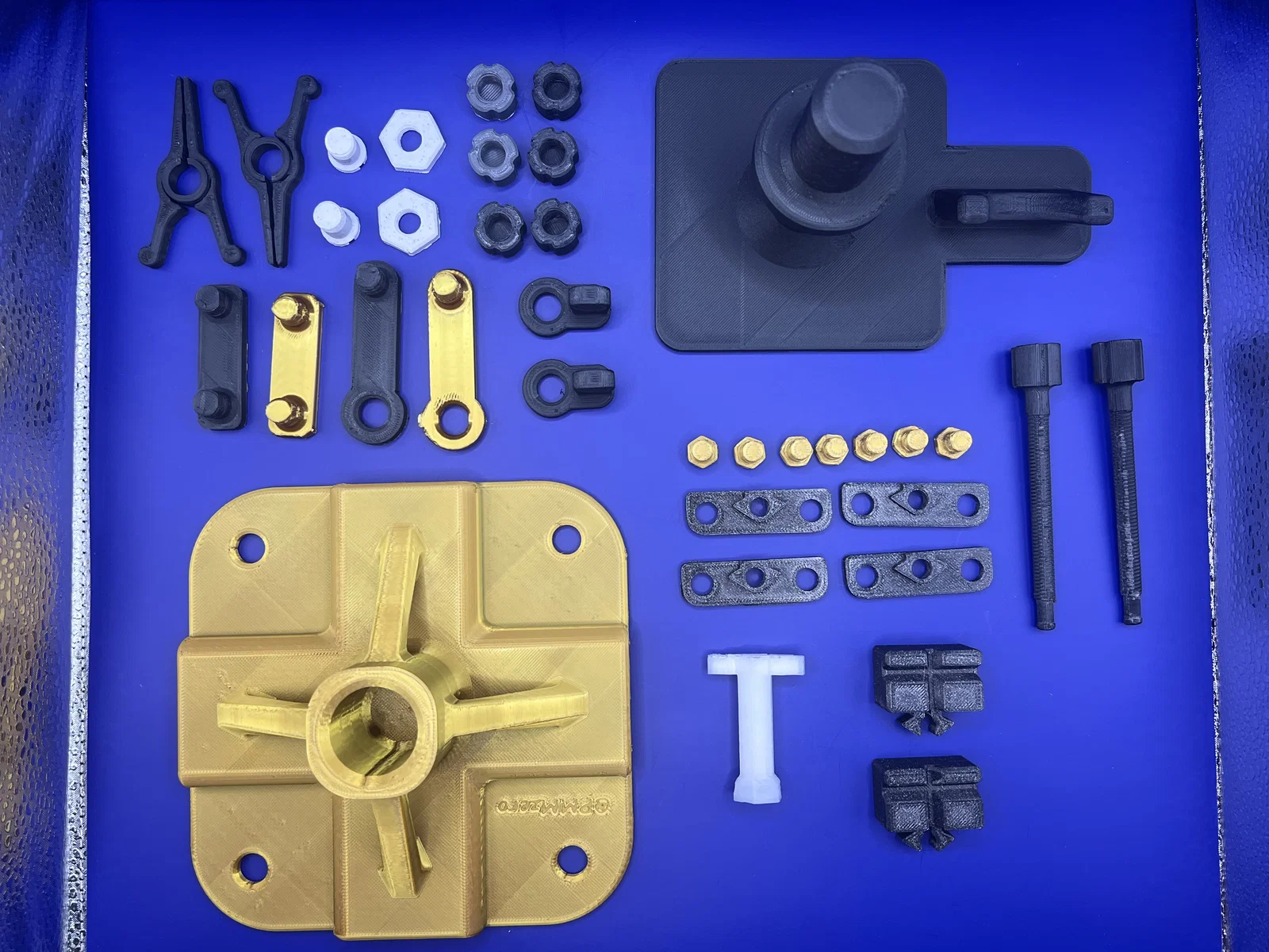 Model Turner Rotating VICE V2 bản Internal Winding Bolt: tay vặn giữ cố định, file mới bắt đầu “MT V2 VICE”. Có PDF lắp ráp, kèm socket wrench (nên in PETG). Hỗ trợ tối đa 4 kẹp và 4 tay chỉnh.