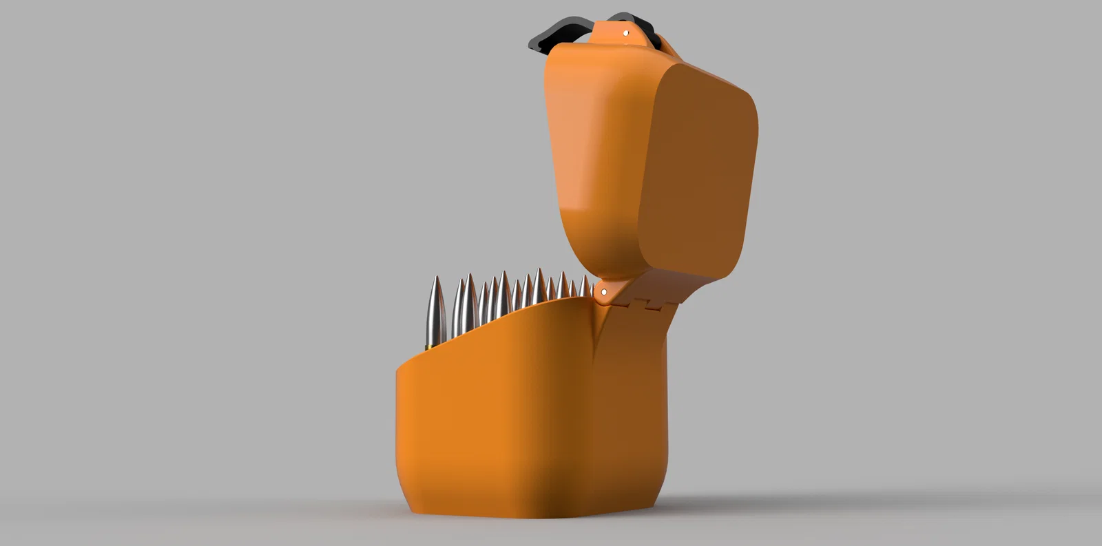 Hộp đạn 6.5 Creedmoor cho 20 viên, khoảng cách insert trên/dưới 75,24 x 12,60 mm. Có rãnh o-ring (dây 2mm), bản lề & latch dùng chốt TIG 2mm. Khuyến nghị in latch bằng ABS để bền và chạy chuẩn.
