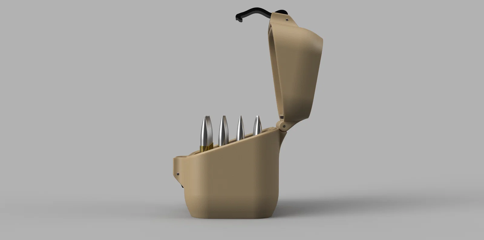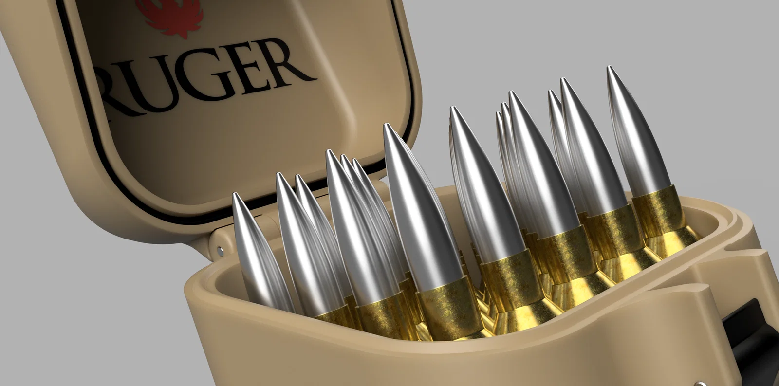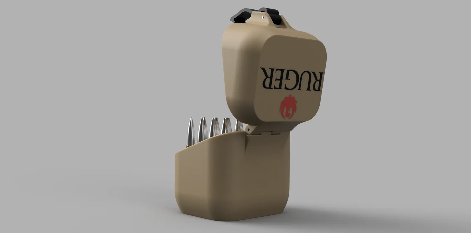 Hộp đạn Ruger 6.5 Creedmoor với bố trí 20 viên, khoảng cách 75,24x12,60mm giữa insert trên/dưới. Có rãnh gắn o-ring 2mm, bản lề & latch dùng chốt TIG 2mm. Khuyên in latch bằng ABS để bền.