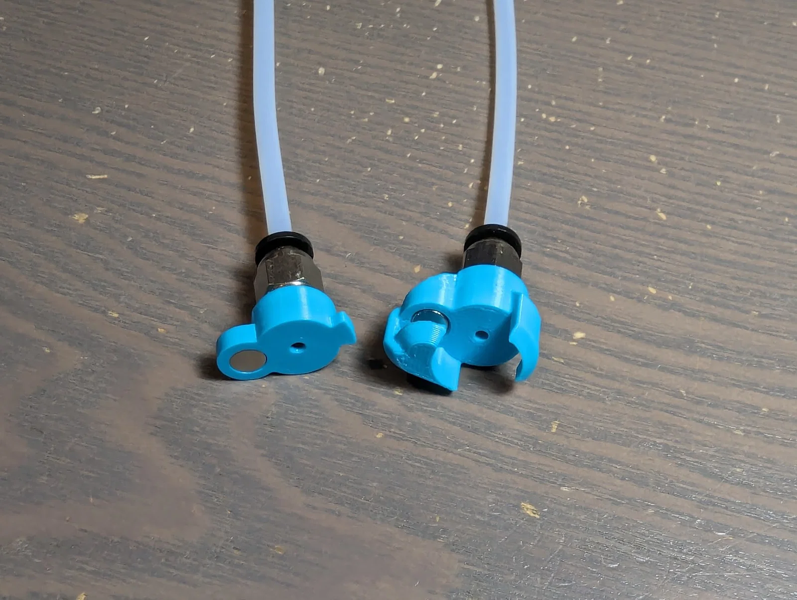 - Đây là một bộ ngắt/kết nối PTFE dạng twist lock siêu nhẹ (dưới 14 gram), dùng (2) nam châm đất hiếm 6mmx3mm (xem phần dưới về độ dày thực tế) để giữ vị trí khóa, và (2) đầu nối khí nén PC4M10 hoặc (2) PC4M6.