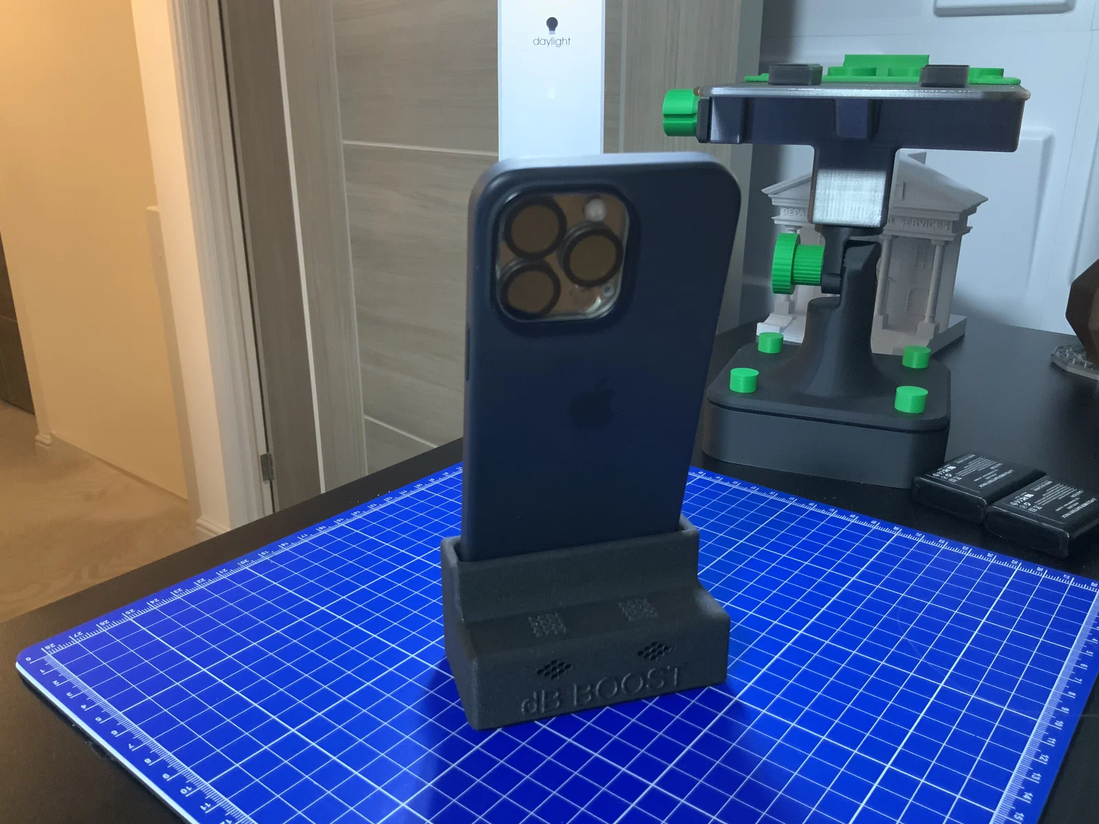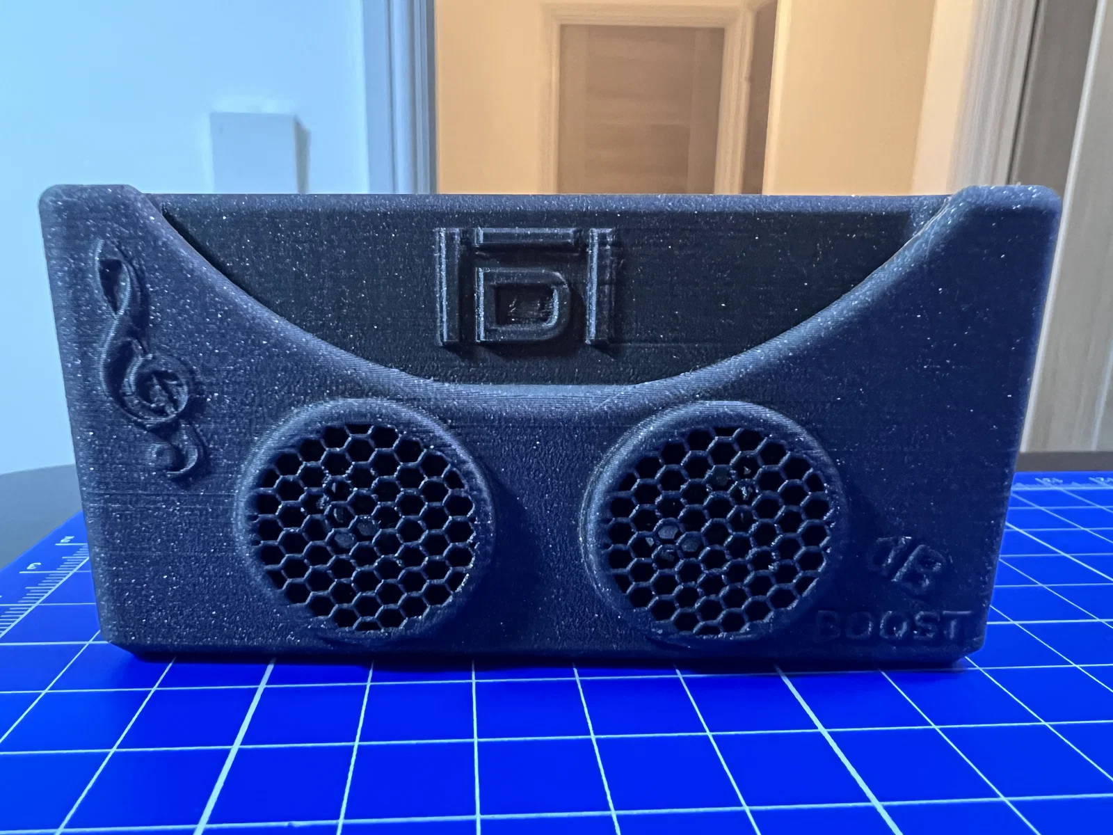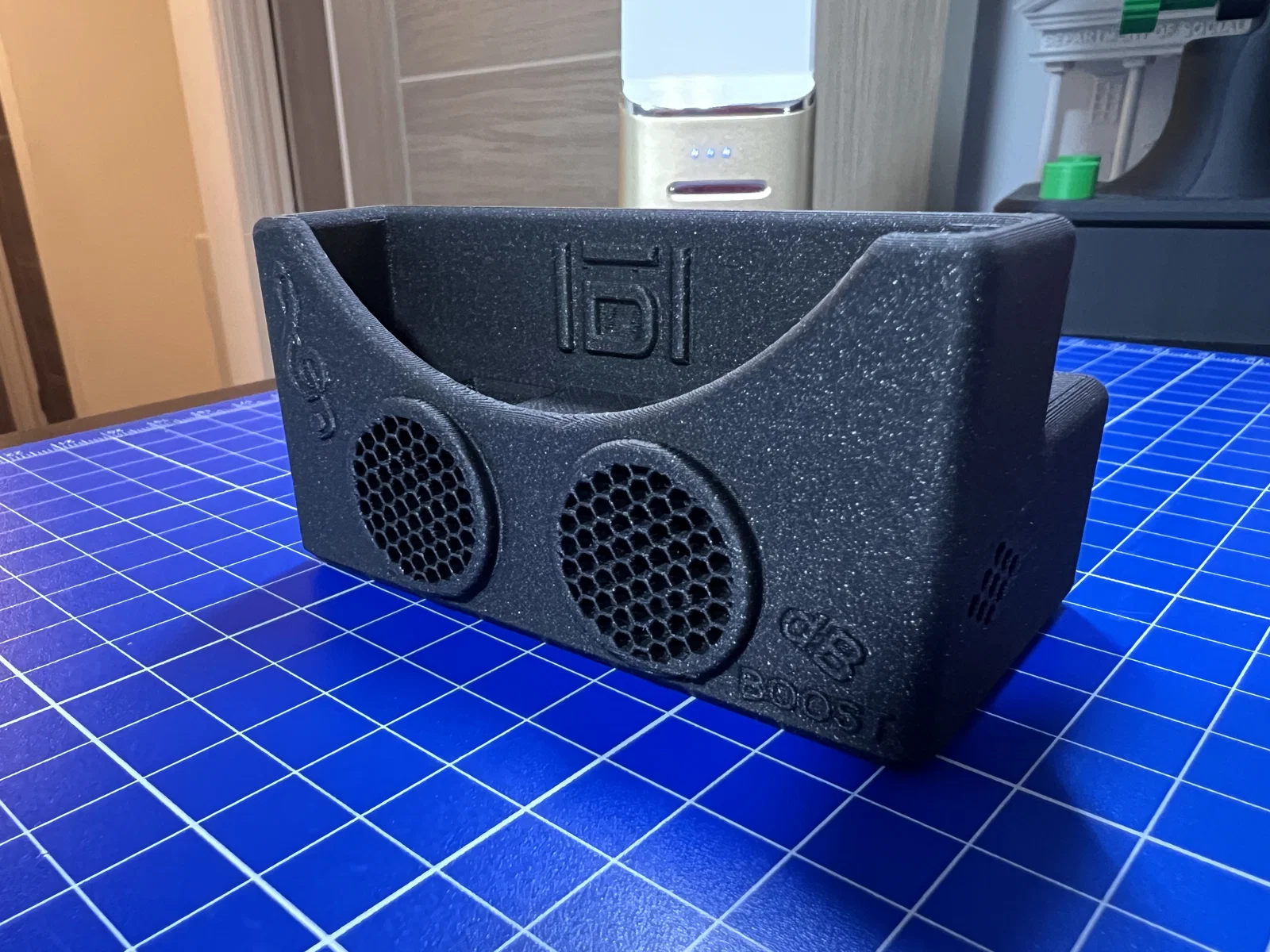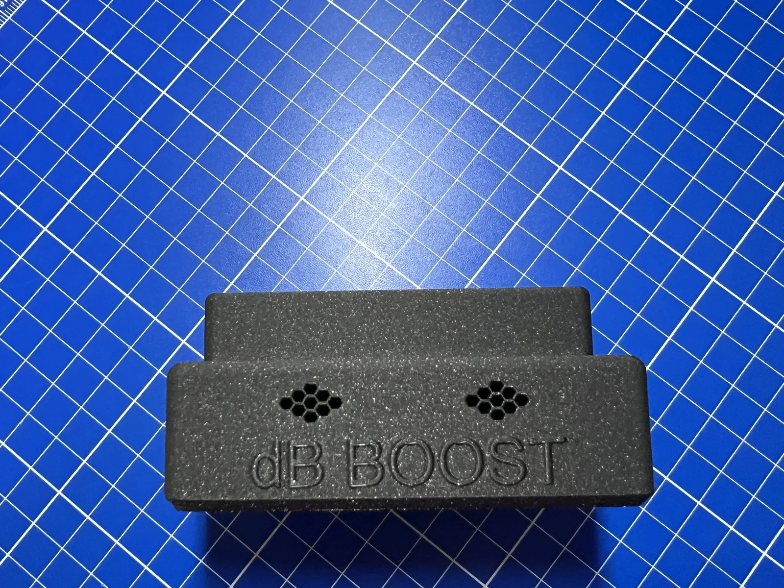 dB BOOST là giá đỡ iPhone kiêm bộ khuếch đại âm thanh để bàn. Khe 80×15mm, hợp với các máy có loa ở đáy (tối ưu cho iPhone 13 Pro). In được không cần supports trên Bambu X1C.