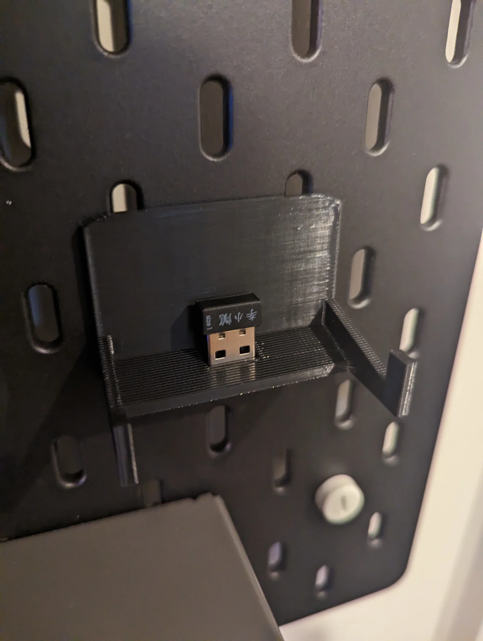 Điểm cộng lớn nhất của mẫu thiết kế này chính là sự tiện lợi khi tích hợp khe cắm dành riêng cho đầu thu tín hiệu USB (dongle). Bạn sẽ không bao giờ phải lo lắng về việc thất lạc đầu thu nhỏ xíu của chuột không dây nữa, vì mọi thứ đã được sắp xếp gọn gàng ngay tại vị trí treo chuột. Việc tháo lắp lên bảng Skadis cũng cực kỳ dễ dàng, giúp bạn linh hoạt thay đổi vị trí trưng bày theo ý thích mà không cần bất kỳ dụng cụ hỗ trợ phức tạp nào.