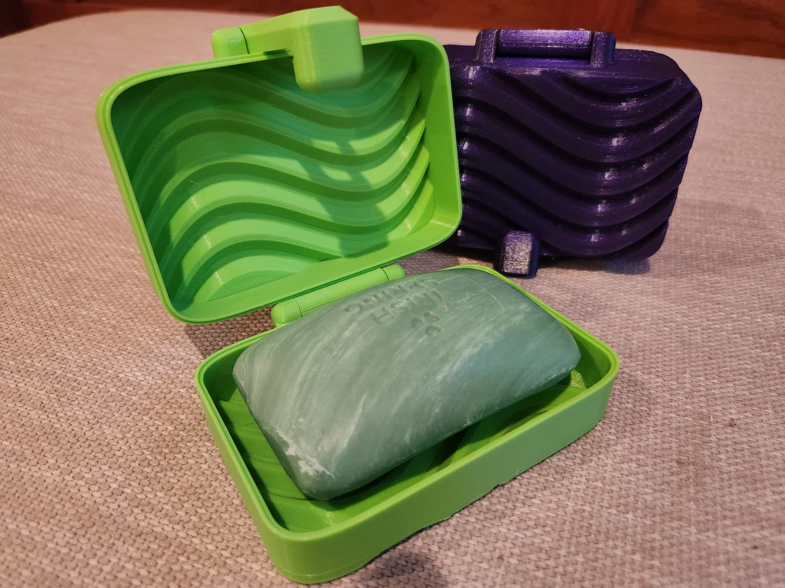 Hộp xà phòng dáng cong chắc chắn, có gờ nâng giúp xà phòng khô nhanh và chốt gài tích hợp để đóng kín khi đi du lịch. Thiết kế print-in-place, không cần support, kèm 3 size cho xà phòng dày đến 40 mm.