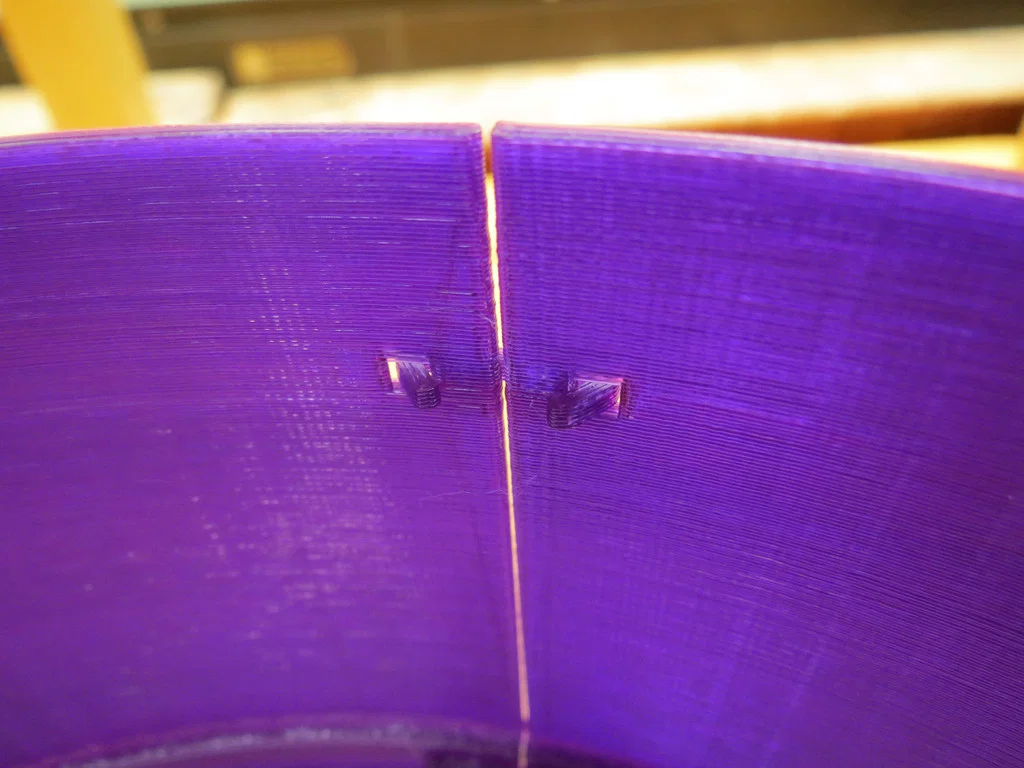 Version 2? (2019-06-25): Một điểm mình không hài lòng là phần đầu trên bị lỏng và lắc (flop và wobble), nhất là khi/đến lúc các snap pins bắt đầu hơi lỏng ra theo thời gian. File v2segment88mm.stl có vài lỗ vuông gần mỗi mép ngoài ở gần phía trên, và v2clip.stl dùng để giữ chúng lại với nhau. Các ảnh dùng filament màu tím là phiên bản này. Không chắc nó hữu ích tới đâu, nhưng làm mình thấy “đã” hơn :-) Cần chiều cao khác hoặc cần file FreeCAD (hơi bừa bộn) thì cứ báo mình.