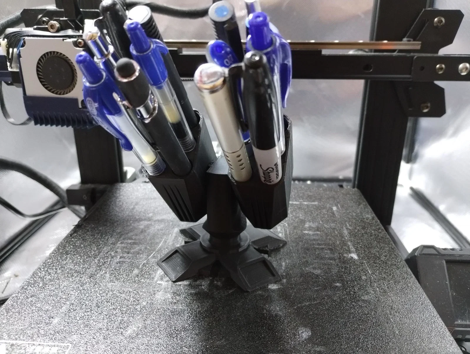 Mình muốn làm một hộp cắm bút kiểu Missile Turret gọn gàng, vừa trong ô Gridfinity 2x2. Cuối cùng mình thiết kế model này thành 3 phần. Chứa được 12 cây bút/viết chì.