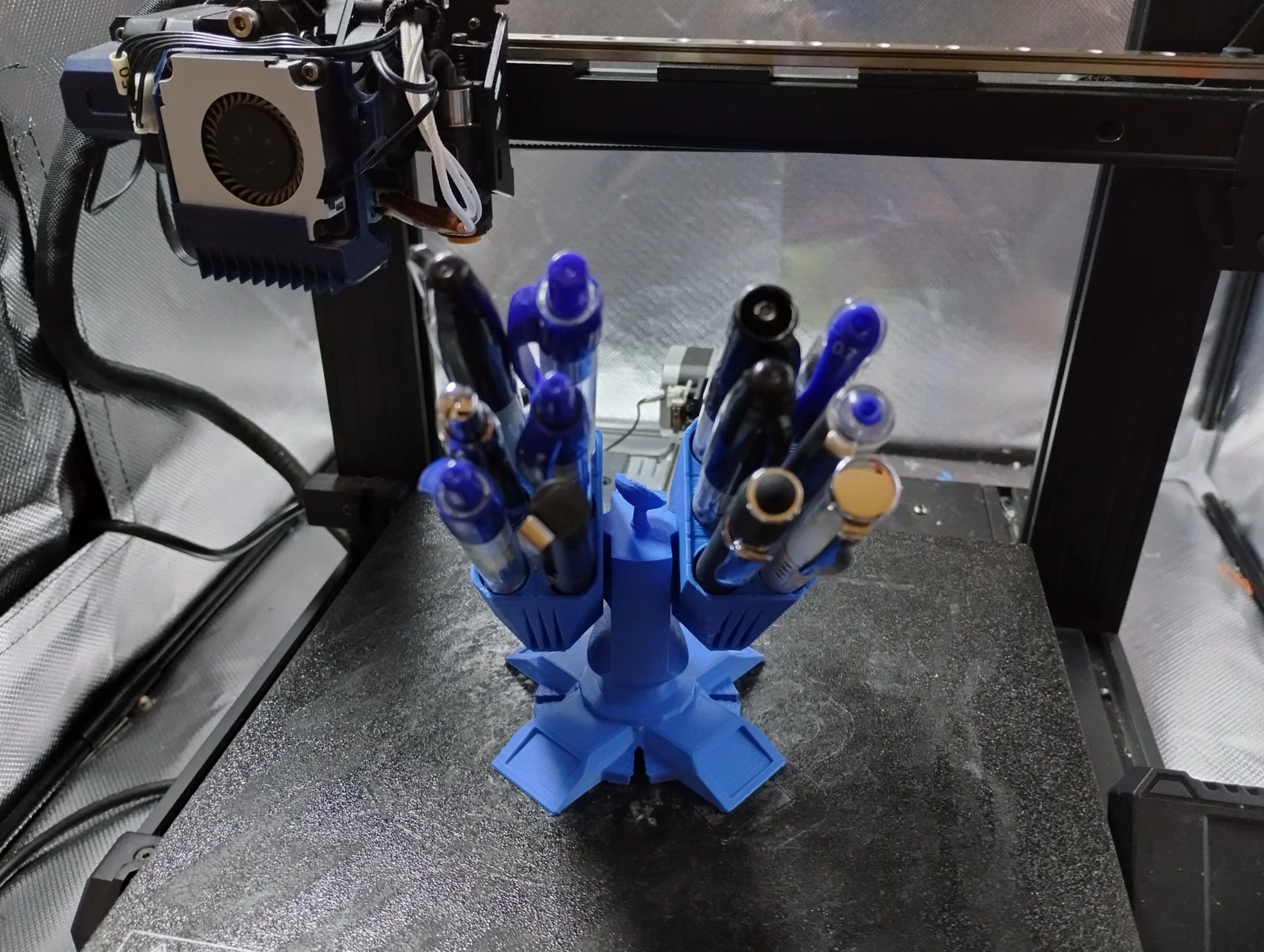 Nhiều người muốn mẫu này đứng vững hơn, nên mình thiết kế lại một chút và làm thành dạng một khối (single piece) để in. Giữ được 12 cây bút/bút chì. Mình cũng thêm một cái chảo vệ tinh nhỏ ở trên đỉnh cho vui.