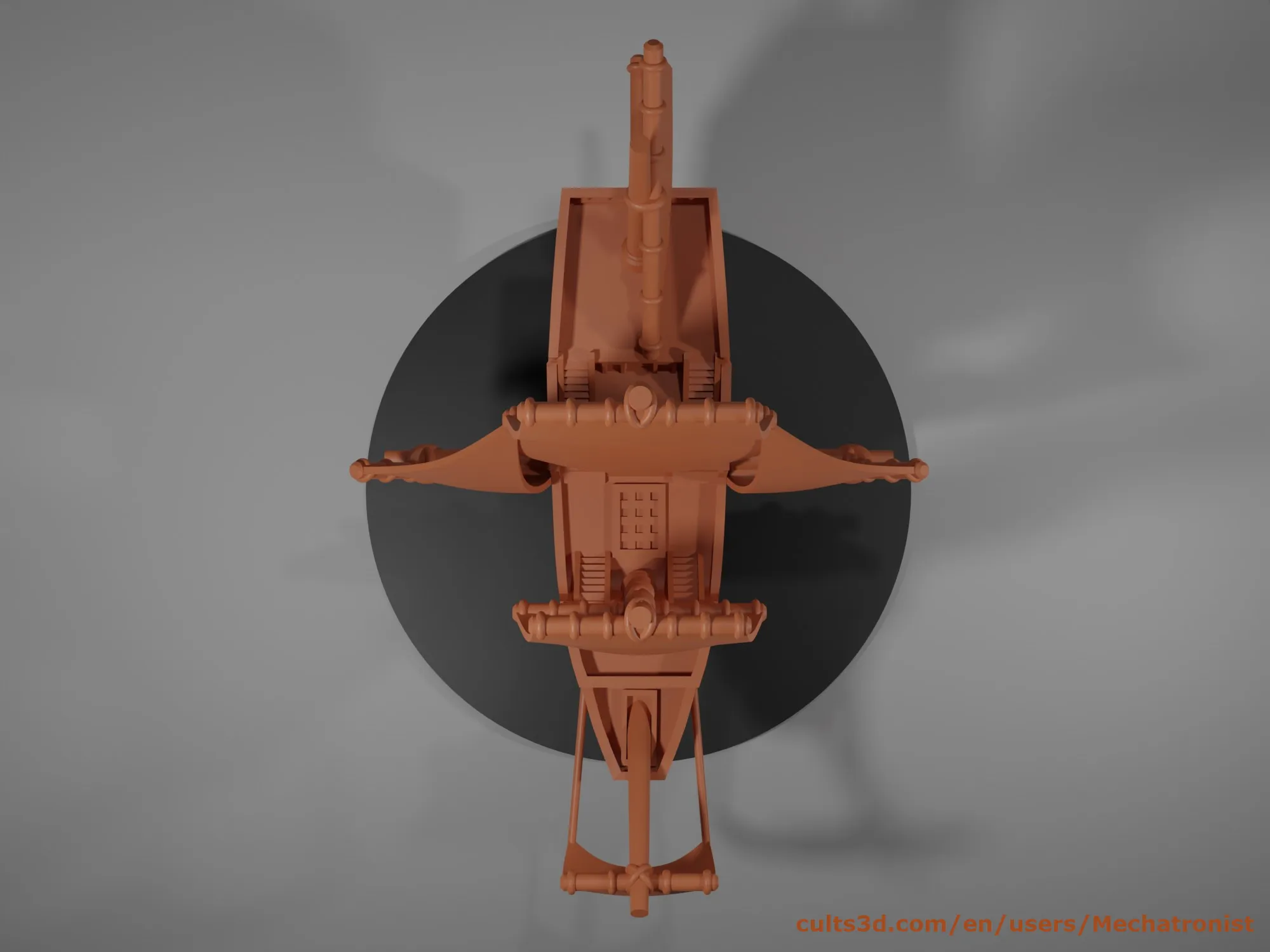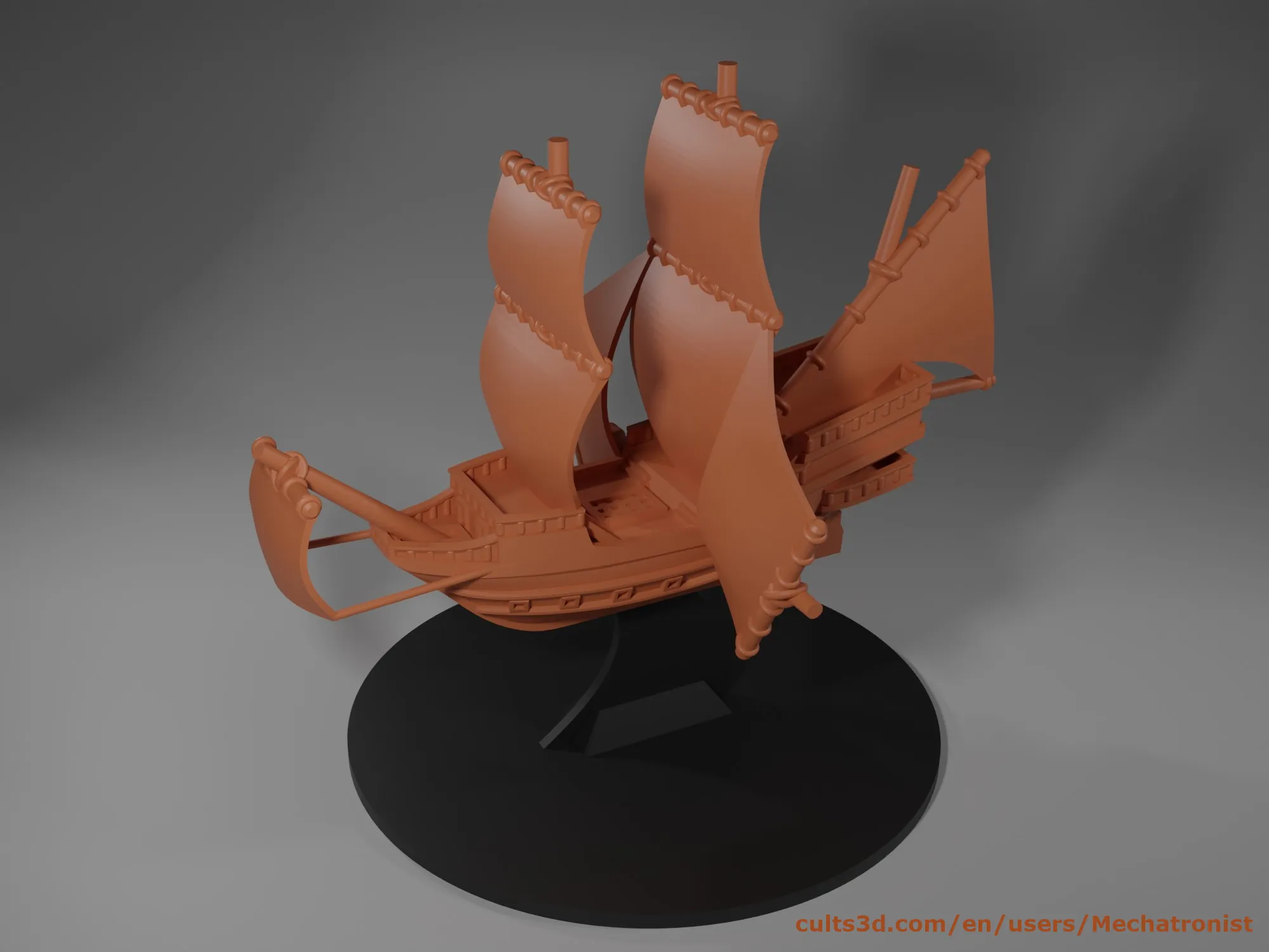 Một mô hình thu nhỏ của một con tàu galleon bay với những cánh buồm phụ nhô ra hai bên. Mô hình này có thể được sử dụng như một con tàu galleon không gian trong trò chơi Dungeons and Dragons Spelljammer hoặc trong các trò chơi giả tưởng trên bàn khác. Mô hình này có tỷ lệ 1:600. Đây là tỷ lệ giống như các mô hình tàu Spelljammer chính thức được sản xuất bởi Wizkids. Nó dài khoảng 4 inch (100mm) và rộng 3. 75 inch (95mm). Cả hai kích thước này đều được đo từ đỉnh của các cột buồm. Nó đi kèm với tùy chọn chân đế có đường kính 3 inch (76mm) hoặc 2 inch (51mm). Mô hình được thiết kế để có thể in trên máy in FDM với hỗ trợ tối thiểu. Cũng có một phiên bản được bao gồm để in trên máy in resin, có cấu trúc rỗng và có tùy chọn hỗ trợ trước. Khi in, không sử dụng vòi phun lớn hơn 0. 4mm. Tôi khuyên bạn nên sử dụng chiều cao lớp là 0. 1mm. Đặt góc nghiêng của hỗ trợ là 60 độ để tránh tạo ra các hỗ trợ không cần thiết. Tôi đã thấy rằng trong eSlicer, mẫu hỗ trợ zig zag mặc định không tạo ra hỗ trợ đúng cách cho một số khu vực mỏng hơn trên mô hình. Mẫu hỗ trợ lưới hoạt động tốt với tôi. Nếu bạn có kế hoạch sơn mô hình này, tôi gợi ý in nó bằng filament màu đen vì có một số điểm khó tiếp cận bằng cọ sơn và các khe hở không sơn sẽ ít nổi bật hơn nếu chúng màu đen. Một phiên bản của mô hình này không có cánh buồm bên có thể được tìm thấy miễn phí ở đây: