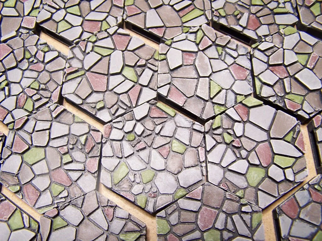 Bộ 72 mẫu gạch nền đá độc nhất cho Tabletop. Tất cả nằm trong file .3mf, scale sẵn 38.1mm x 33mm cho Maghex (có thể re-scale). In 0.2mm, infill 5%, không cần supports; bật ironing cho mặt trên mịn.