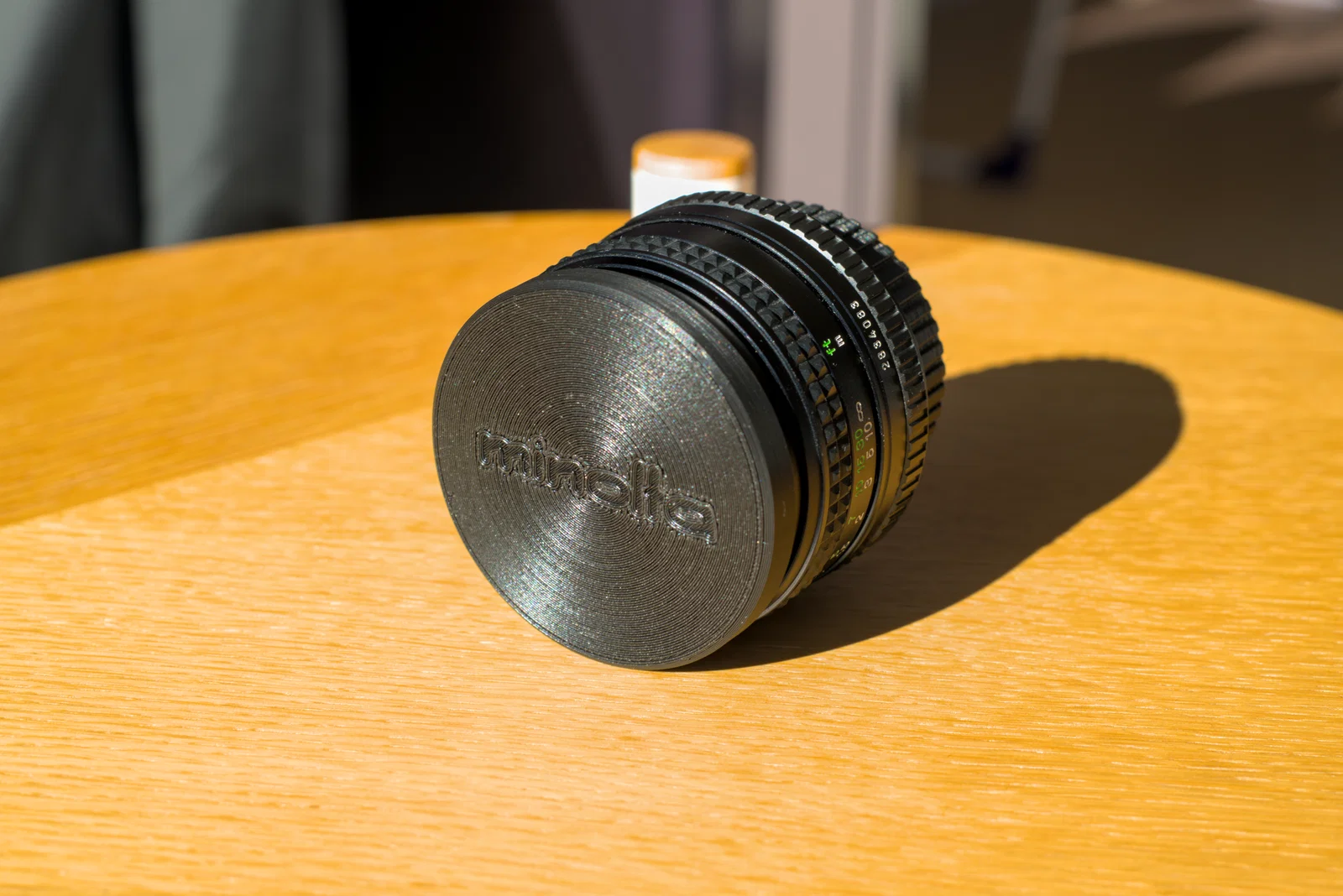 Nắp đậy trước kiểu pressure fit cho Minolta MD Rokkor 50mm 1:1.7 (1977), dùng filter 55mm (đường kính ngoài 57mm). Có logo đúng thời kỳ. Khuyến nghị in PETG/ASA vì PLA dễ lỏng khi gặp nắng.