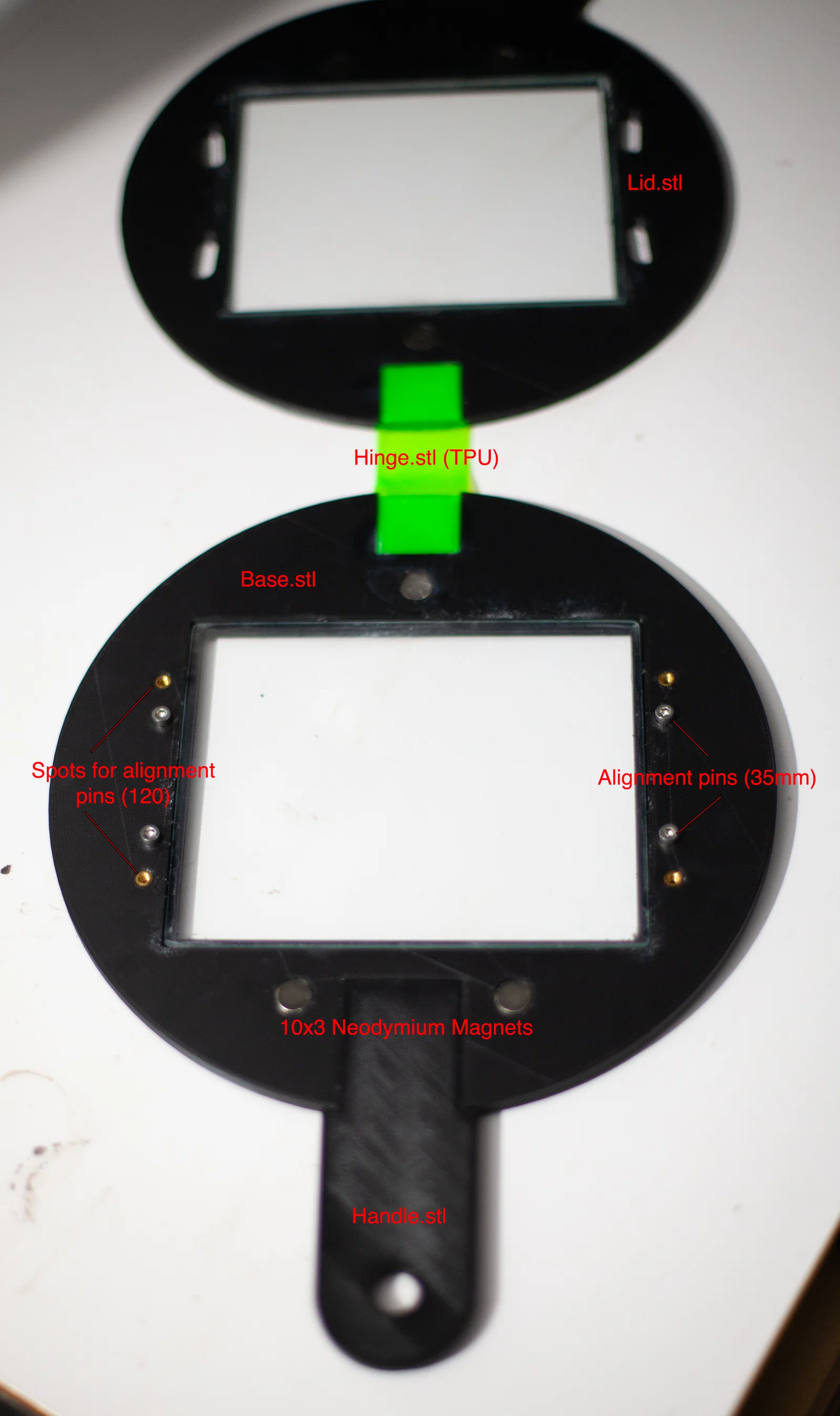 - Lau kính thật sạch và cẩn thận, rồi dán vào Base.stl và Lid.stl. Đảm bảo kính nằm sát hết và phẳng. Đoạn này dùng epoxy sẽ tốt hơn 502. Mình khuyên là sau khi đặt kính vào đúng rãnh (recess) thì đóng negative carrier lại liền để hai mặt ép phẳng vào nhau. Sau đó đặt thêm vật nặng lên trên trong lúc keo khô, để khi đóng lại thì hai tấm kính tiếp xúc tốt nhất có thể.