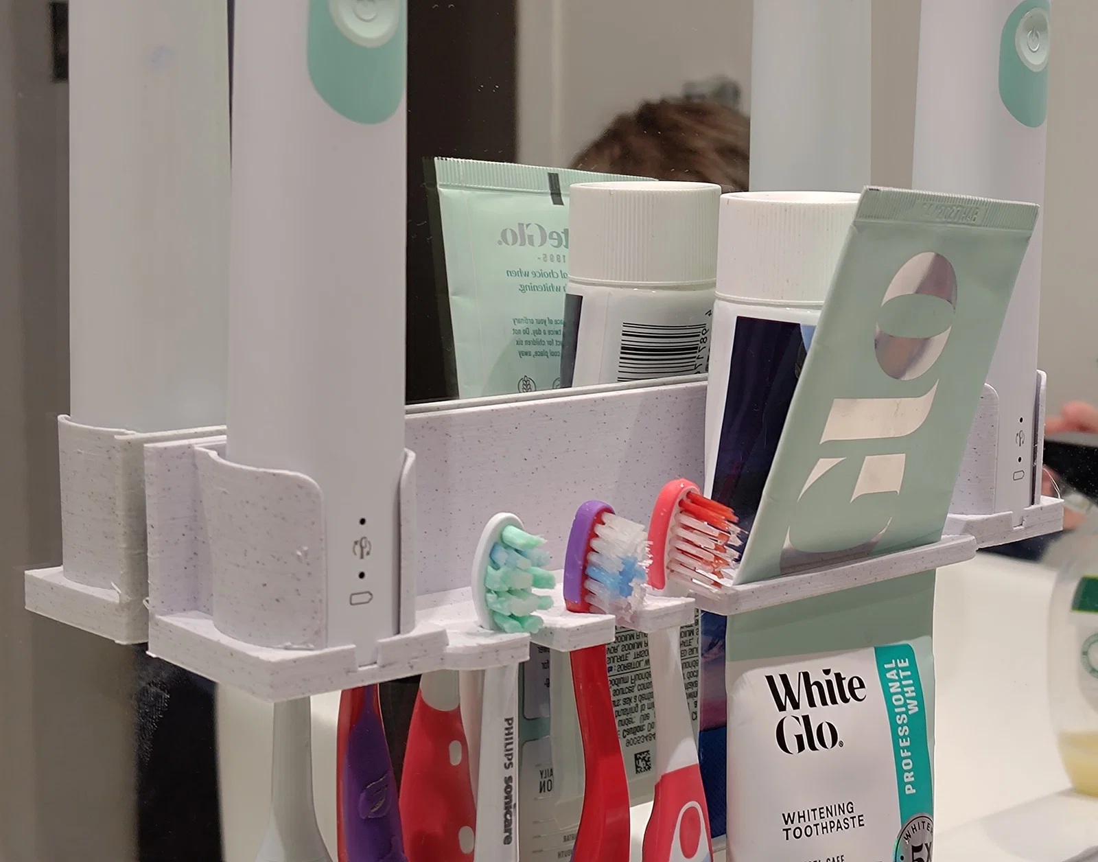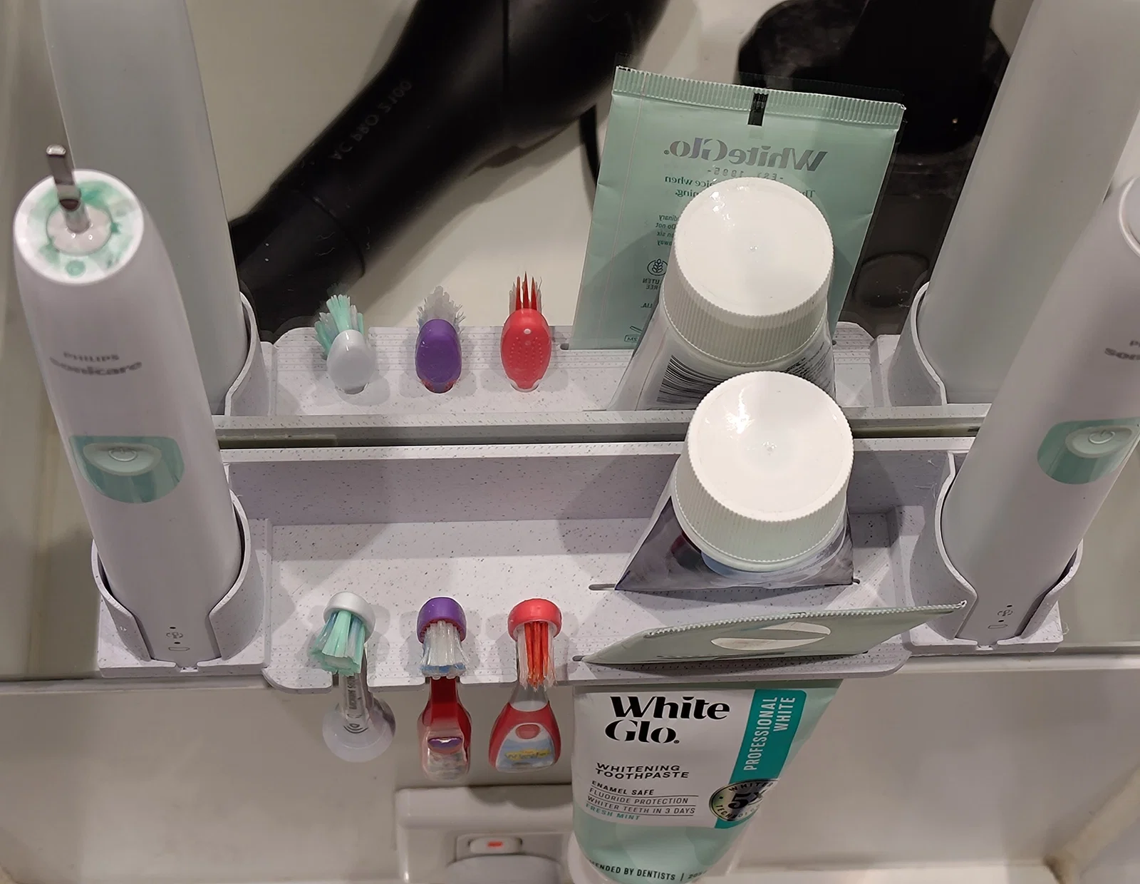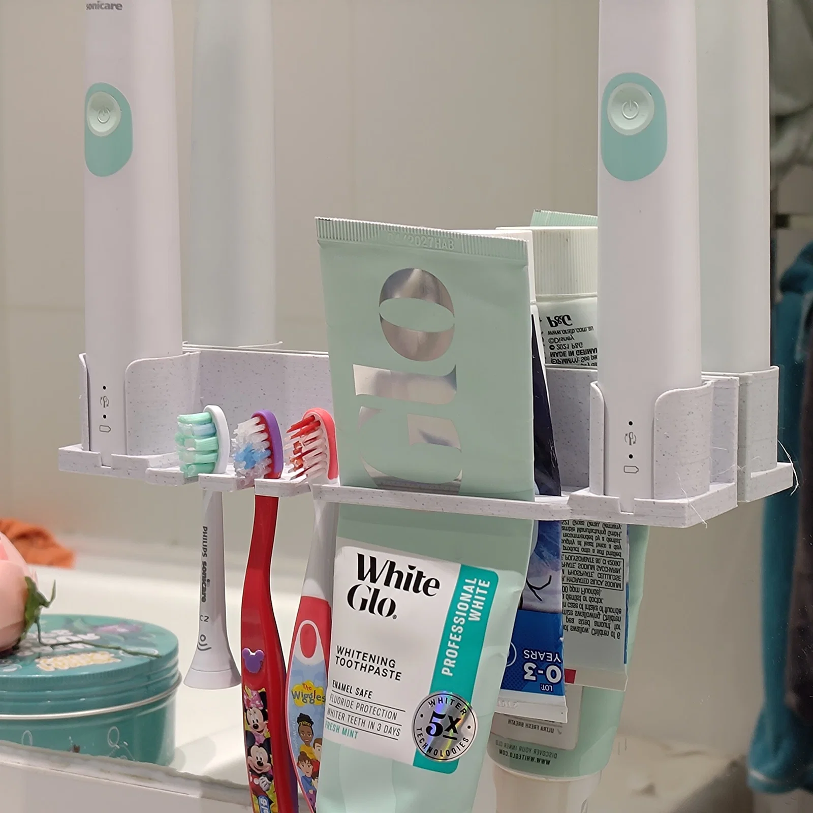 Giá đỡ dán gương/gạch bằng băng keo 2 mặt hoặc 3M, giữ gọn 3 bàn chải thường, 2 bàn chải điện Phillips và 2 tuýp kem. Có tích hợp chức năng bóp kem để tận dụng hết kem trong tuýp.