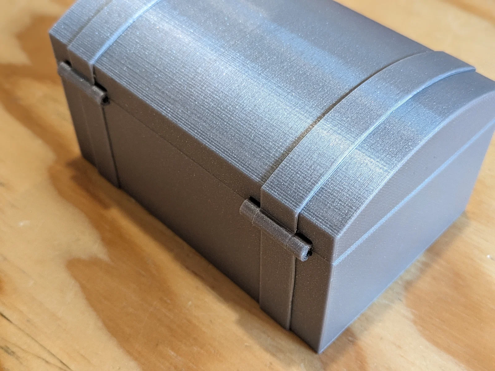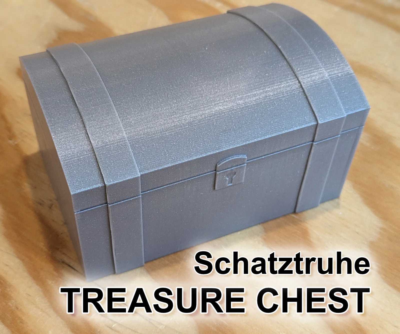 Rương kho báu đơn giản gồm 2 phần, có kèm file slicer với supports. Dùng nam châm 6x3 để giữ nắp đóng chắc, bản lề bằng filament. Hướng in đặt thân và nắp nằm nghiêng/bên hông (xem file PSlicer).