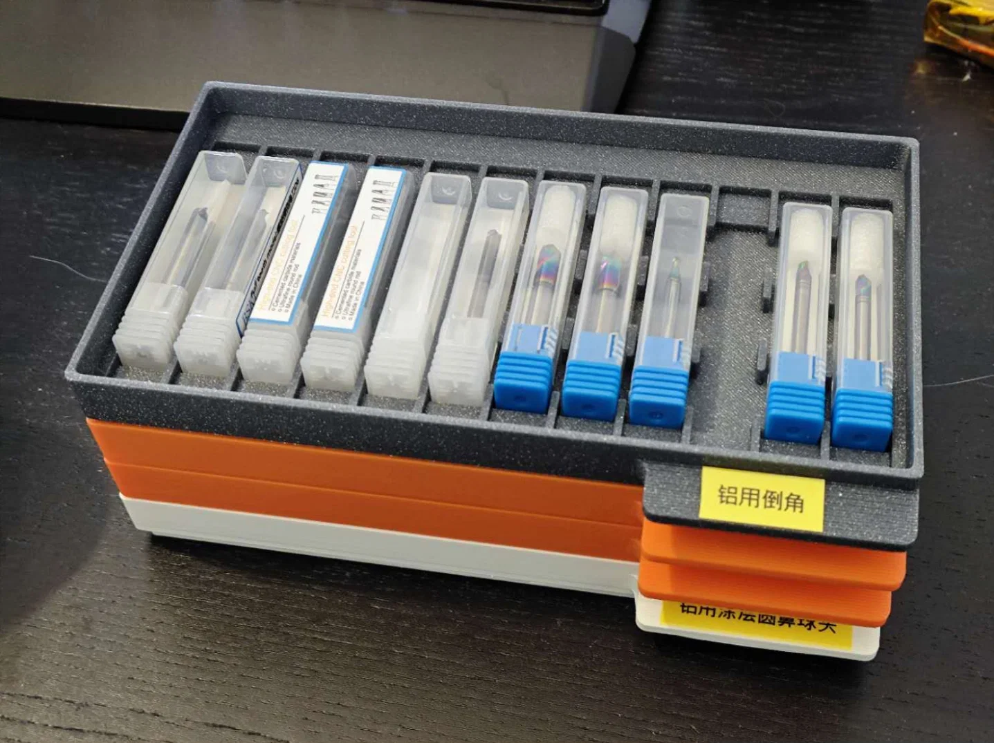 Khay end mill dạng modular có thể xếp chồng để cất trong ngăn kéo hoặc chồng gọn khi không gian chật. Có chỗ dán sticker để ghi nhãn. Hợp nhiều cỡ hộp, kể cả hộp dài; in PLA 0.2mm, support chỉ trên build plate.