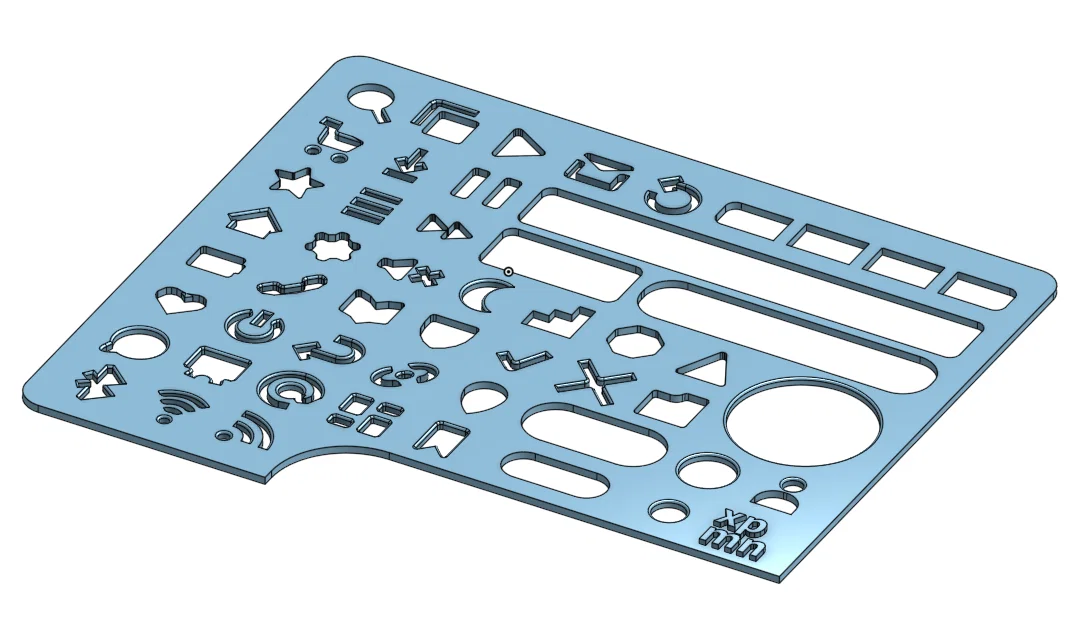 Bộ stencil gồm các icon UI/UX phổ biến, ô nhập liệu, control, đường cong… tiện để phác thảo mockup nhanh. Khuyên in layer 0.12–0.15mm bằng PLA; PETG vẫn in được nhưng dễ bị stringing cần hậu xử lý.