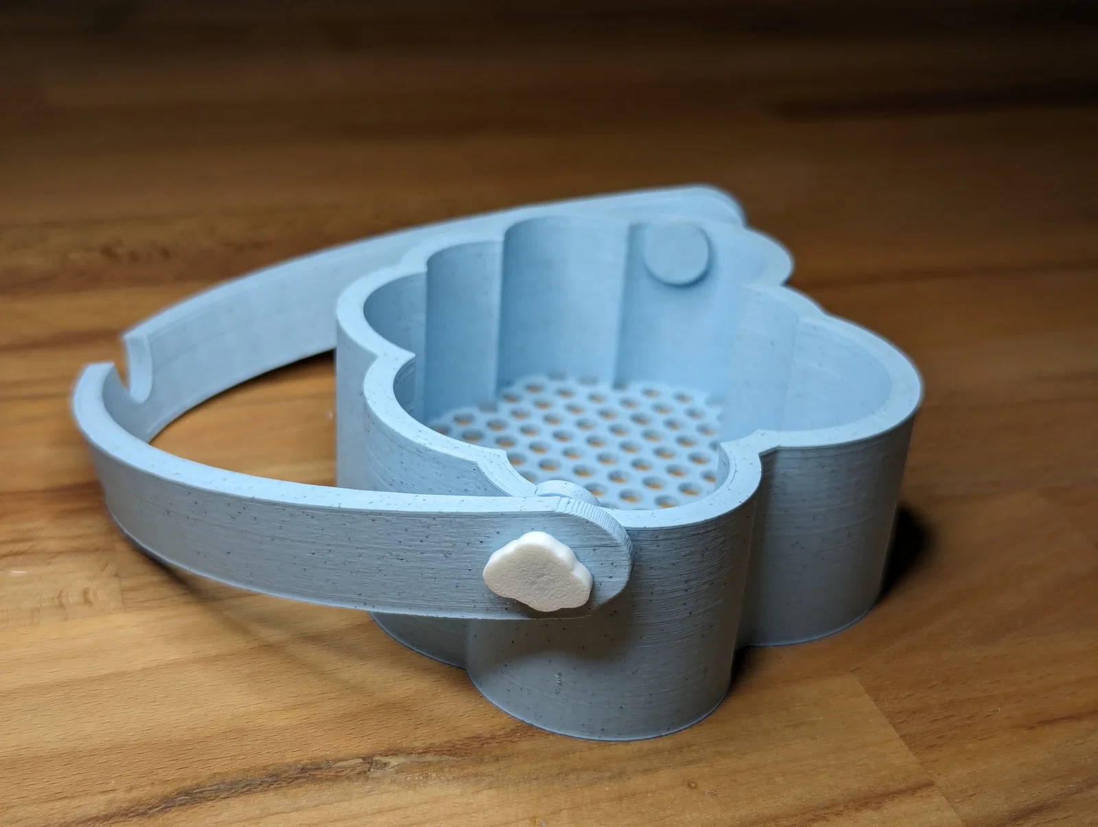 Giỏ hình đám mây để giữ bubble bar ngay dưới vòi bồn tắm, giúp tạo bọt dễ hơn. Có 2 loại tay cầm cho vòi hẹp hoặc vòi rộng/dẹt. Bản v3 in không cần support, lắp bằng pin và pin cap (cap_circle.stl/cap_cloud.stl).