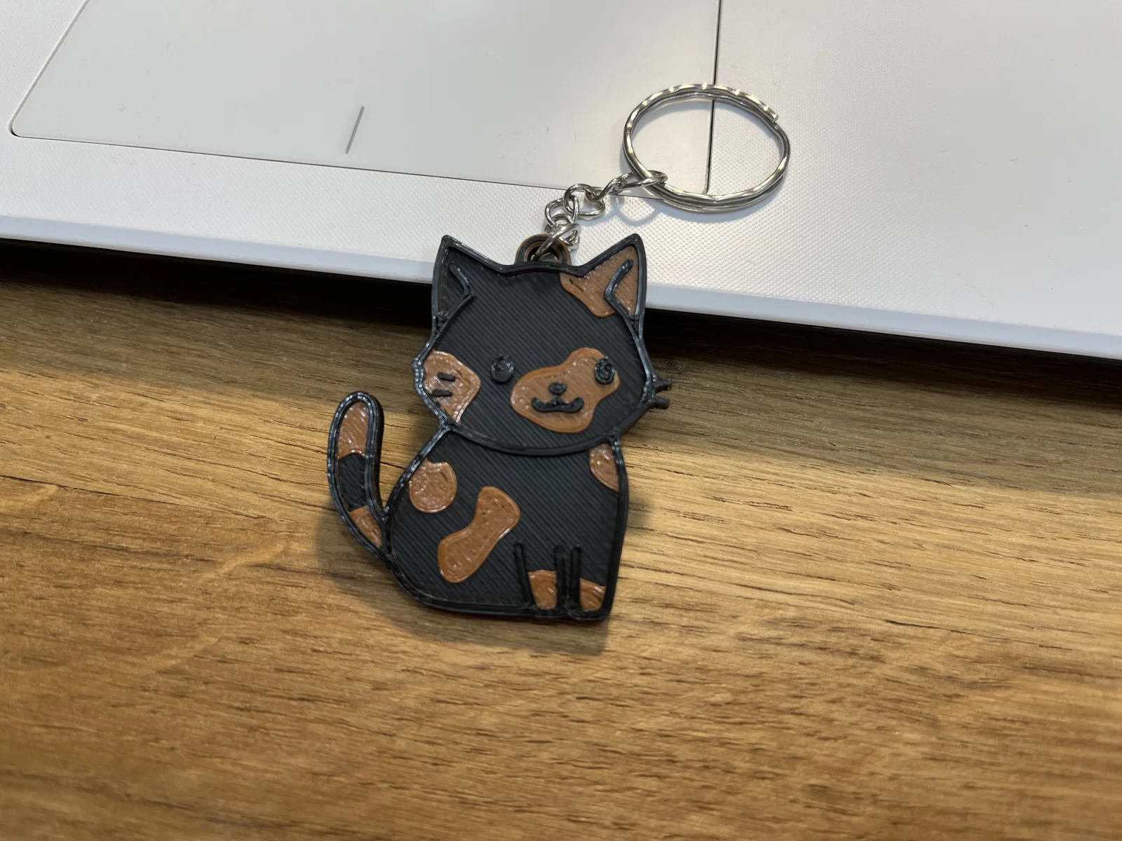 Mẫu móc khóa mèo tortoiseshell siêu dễ thương, kích thước 40x50mm và dày 3.2mm. Có hướng dẫn đổi màu theo layer để in multicolor: Black → Brown ở layer #13, rồi quay lại Black ở layer #15.
