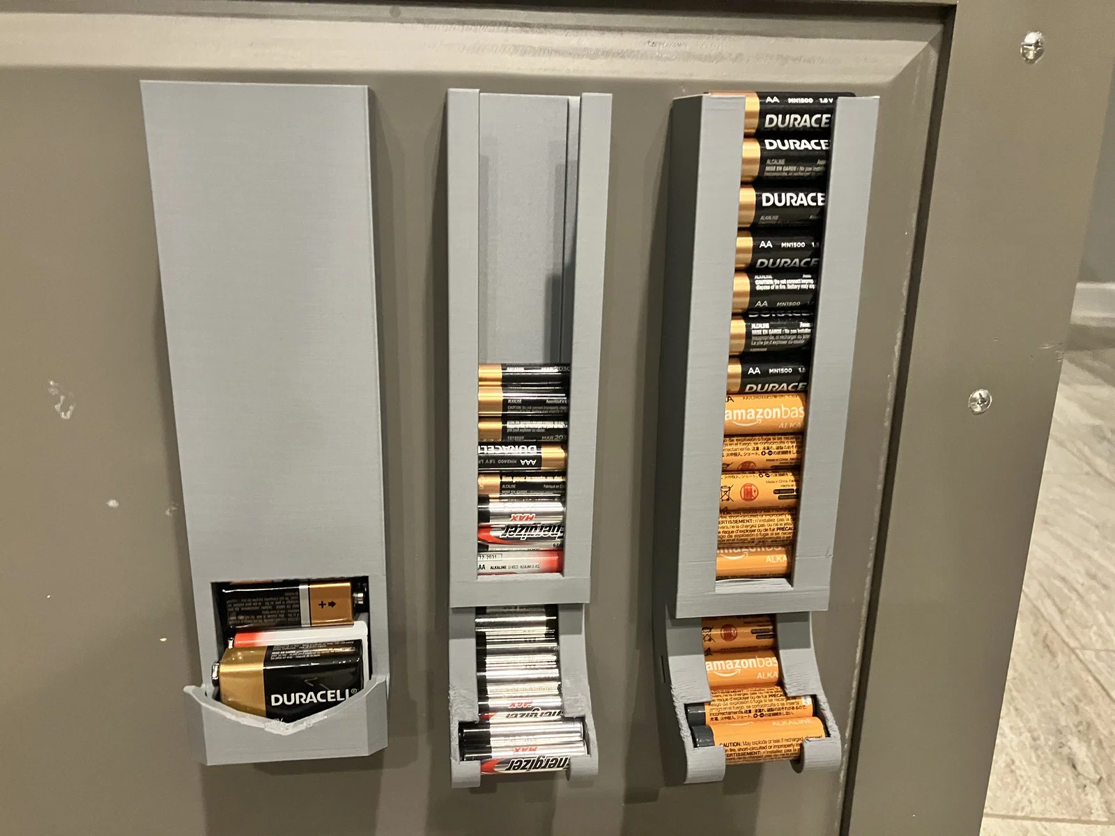 Mẫu khay nhả pin AA, AAA và 9V để gắn ở mặt trong cánh tủ. Bản AA xếp 2 tầng chứa 30 viên, AAA xếp 2 tầng chứa 32 viên, còn 9V xếp 1 tầng chứa 12 viên. In với slim tree support, dán bằng băng keo hai mặt.